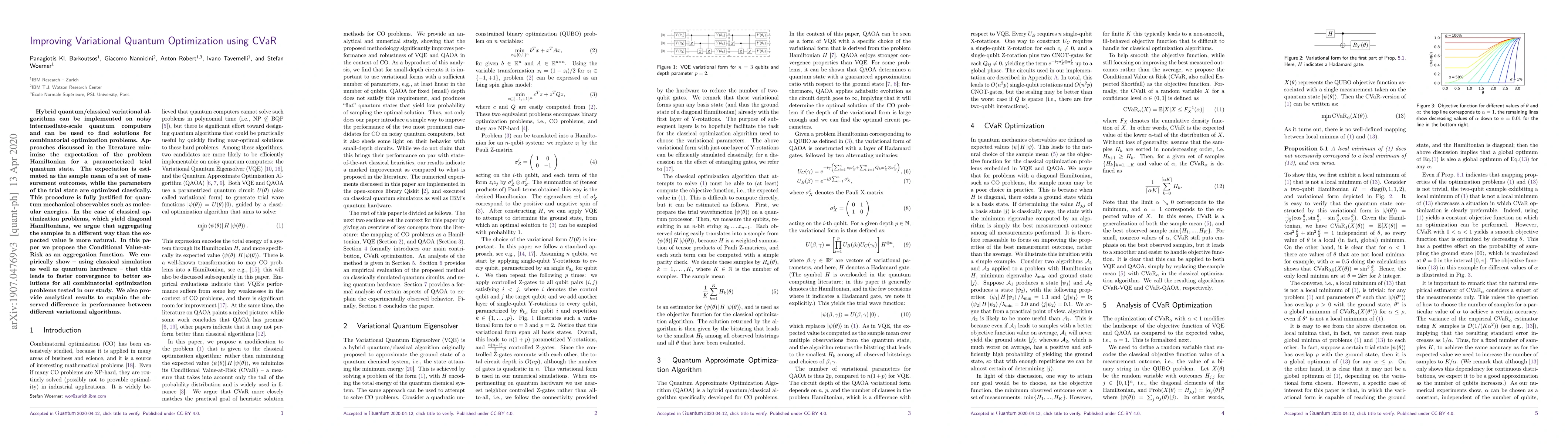 This paper proposes using Conditional Value-at-Risk (CVaR) as an aggregation function in variational quantum optimization algorithms to improve convergence for combinatorial optimization problems. Empirical and analytical results show that CVaR leads to faster convergence and better solutions compared to traditional expectation-based methods.