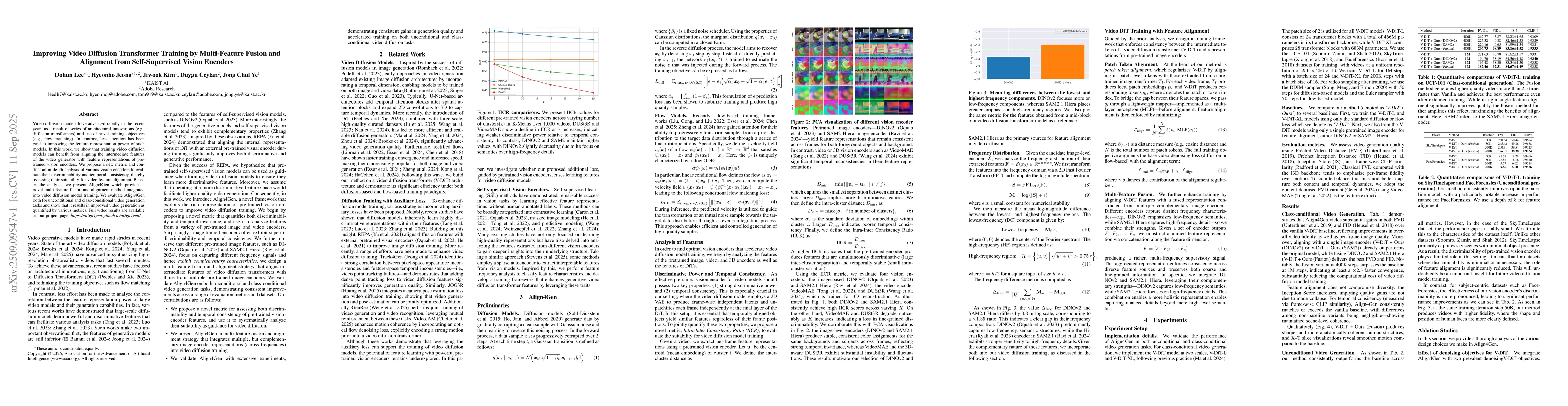 Video diffusion models have advanced rapidly in the recent years as a result of series of architectural innovations (e.g., diffusion transformers) and use of novel training objectives (e.g., flow matching). In contrast, less attention has been paid to improving the feature representation power of such models. In this work, we show that training video diffusion models can benefit from aligning the intermediate features of the video generator with feature representations of pre-trained vision encoders. We propose a new metric and conduct an in-depth analysis of various vision encoders to evaluate their discriminability and temporal consistency, thereby assessing their suitability for video feature alignment. Based on the analysis, we present Align4Gen which provides a novel multi-feature fusion and alignment method integrated into video diffusion model training. We evaluate Align4Gen both for unconditional and class-conditional video generation tasks and show that it results in improved video generation as quantified by various metrics. Full video results are available on our project page: https://align4gen.github.io/align4gen/