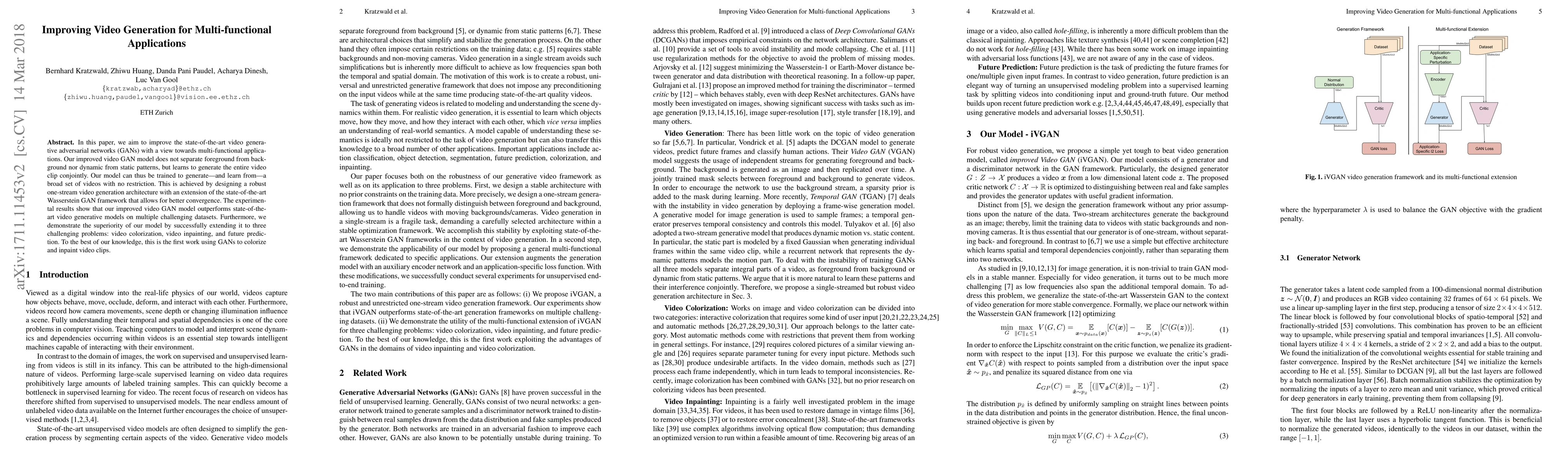 In this paper, we aim to improve the state-of-the-art video generative adversarial networks (GANs) with a view towards multi-functional applications. Our improved video GAN model does not separate foreground from background nor dynamic from static patterns, but learns to generate the entire video clip conjointly. Our model can thus be trained to generate - and learn from - a broad set of videos with no restriction. This is achieved by designing a robust one-stream video generation architecture with an extension of the state-of-the-art Wasserstein GAN framework that allows for better convergence. The experimental results show that our improved video GAN model outperforms state-of-theart video generative models on multiple challenging datasets. Furthermore, we demonstrate the superiority of our model by successfully extending it to three challenging problems: video colorization, video inpainting, and future prediction. To the best of our knowledge, this is the first work using GANs to colorize and inpaint video clips.