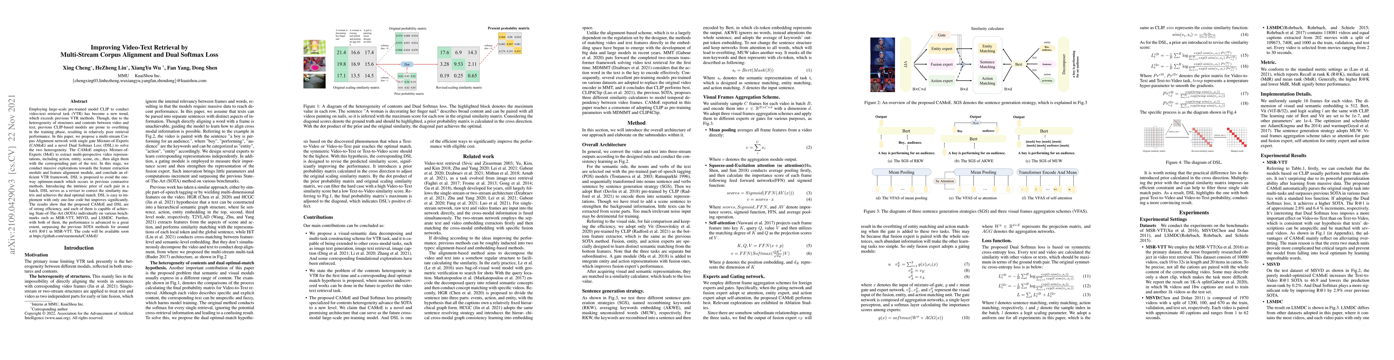 Employing large-scale pre-trained model CLIP to conduct video-text retrieval task (VTR) has become a new trend, which exceeds previous VTR methods. Though, due to the heterogeneity of structures and contents between video and text, previous CLIP-based models are prone to overfitting in the training phase, resulting in relatively poor retrieval performance. In this paper, we propose a multi-stream Corpus Alignment network with single gate Mixture-of-Experts (CAMoE) and a novel Dual Softmax Loss (DSL) to solve the two heterogeneity. The CAMoE employs Mixture-of-Experts (MoE) to extract multi-perspective video representations, including action, entity, scene, etc., then align them with the corresponding part of the text. In this stage, we conduct massive explorations towards the feature extraction module and feature alignment module. DSL is proposed to avoid the one-way optimum-match which occurs in previous contrastive methods. Introducing the intrinsic prior of each pair in a batch, DSL serves as a reviser to correct the similarity matrix and achieves the dual optimal match. DSL is easy to implement with only one-line code but improves significantly. The results show that the proposed CAMoE and DSL are of strong efficiency, and each of them is capable of achieving State-of-The-Art (SOTA) individually on various benchmarks such as MSR-VTT, MSVD, and LSMDC. Further, with both of them, the performance is advanced to a big extend, surpassing the previous SOTA methods for around 4.6\% R@1 in MSR-VTT.
