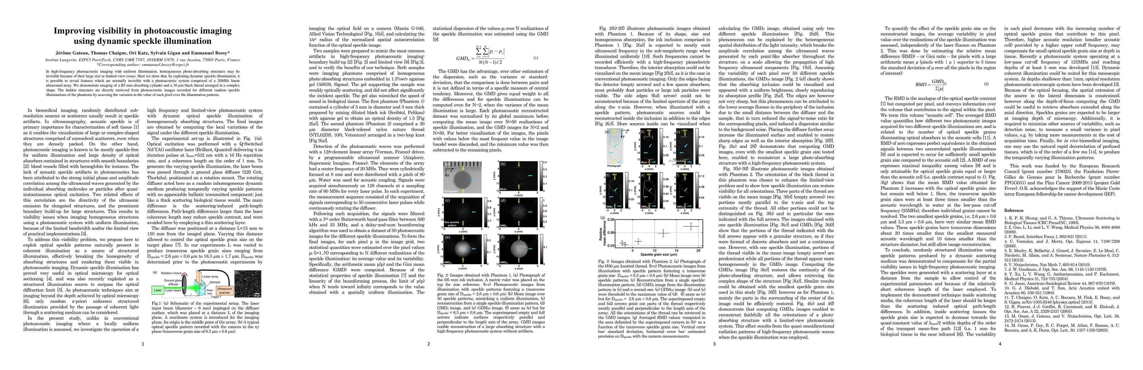 This paper demonstrates that dynamic speckle illumination enhances visibility in high-frequency photoacoustic imaging, revealing previously invisible structures like a 5 mm diameter cylinder and a 30 micrometer black thread by analyzing pixel variations across different speckle patterns.