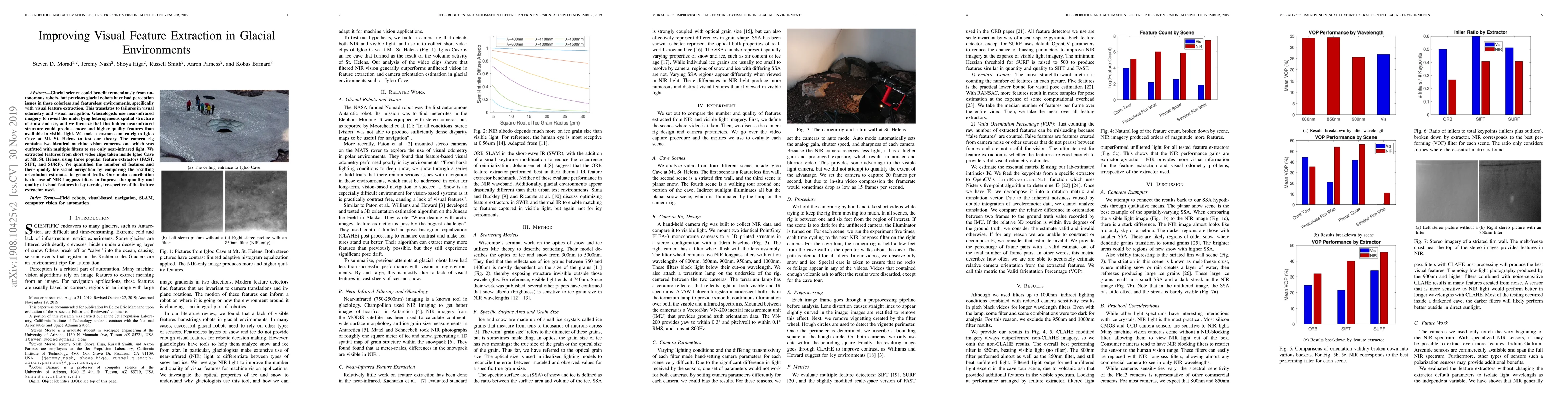 Glacial science could benefit tremendously from autonomous robots, but previous glacial robots have had perception issues in these colorless and featureless environments, specifically with visual feature extraction. This translates to failures in visual odometry and visual navigation. Glaciologists use near-infrared imagery to reveal the underlying heterogeneous spatial structure of snow and ice, and we theorize that this hidden near-infrared structure could produce more and higher quality features than available in visible light. We took a custom camera rig to Igloo Cave at Mt. St. Helens to test our theory. The camera rig contains two identical machine vision cameras, one which was outfitted with multiple filters to see only near-infrared light. We extracted features from short video clips taken inside Igloo Cave at Mt. St. Helens, using three popular feature extractors (FAST, SIFT, and SURF). We quantified the number of features and their quality for visual navigation by comparing the resulting orientation estimates to ground truth. Our main contribution is the use of NIR longpass filters to improve the quantity and quality of visual features in icy terrain, irrespective of the feature extractor used.