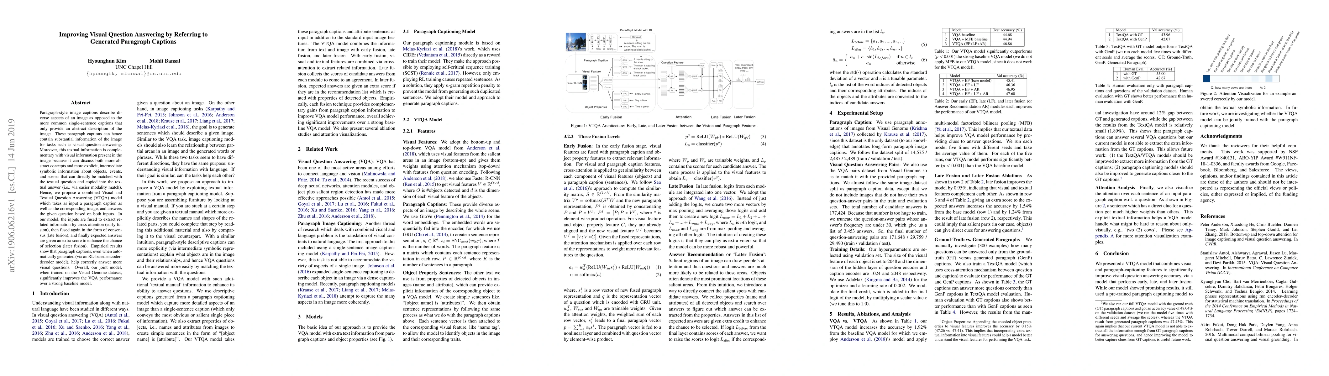This paper proposes a Visual and Textual Question Answering (VTQA) model that leverages automatically generated paragraph captions to enhance visual question answering. The model combines image and caption inputs through cross-attention and consensus fusion, significantly improving VQA performance on the Visual Genome dataset compared to baseline models.