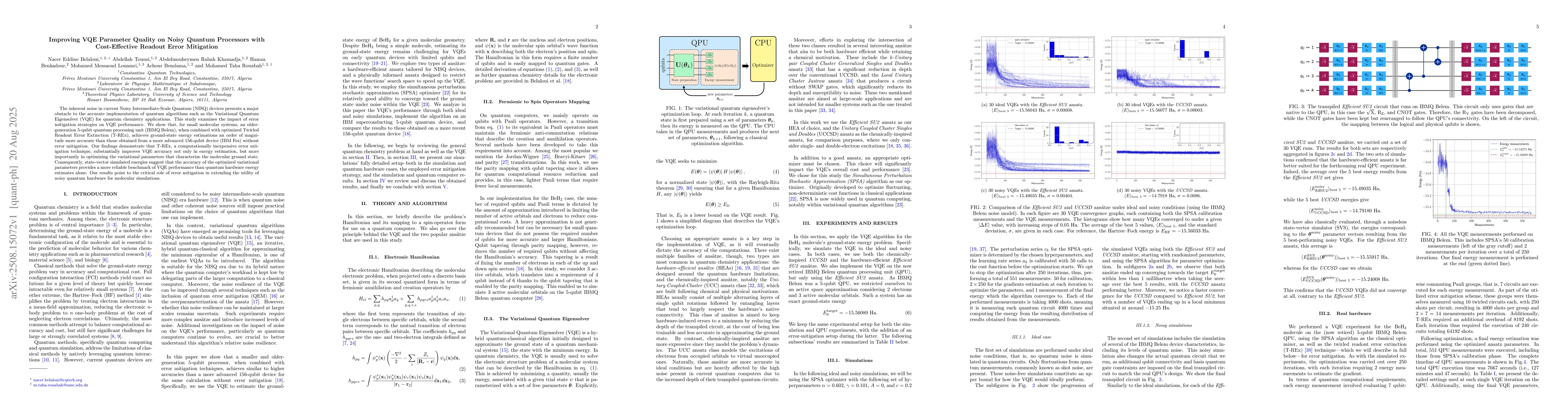 The inherent noise in current Noisy Intermediate-Scale Quantum (NISQ) devices presents a major obstacle to the accurate implementation of quantum algorithms such as the Variational Quantum Eigensolver (VQE) for quantum chemistry applications. This study examines the impact of error mitigation strategies on VQE performance. We show that, for small molecular systems, an older-generation 5-qubit quantum processing unit (IBMQ Belem), when combined with optimized Twirled Readout Error Extinction (T-REx), achieves ground-state energy estimations an order of magnitude more accurate than those obtained from a more advanced 156-qubit device (IBM Fez) without error mitigation. Our findings demonstrate that T-REx, a computationally inexpensive error mitigation technique, substantially improves VQE accuracy not only in energy estimation, but more importantly in optimizing the variational parameters that characterize the molecular ground state. Consequently, state-vector simulated energies suggest that the accuracy of the optimized variational parameters provides a more reliable benchmark of VQE performance than quantum hardware energy estimates alone. Our results point to the critical role of error mitigation in extending the utility of noisy quantum hardware for molecular simulations.