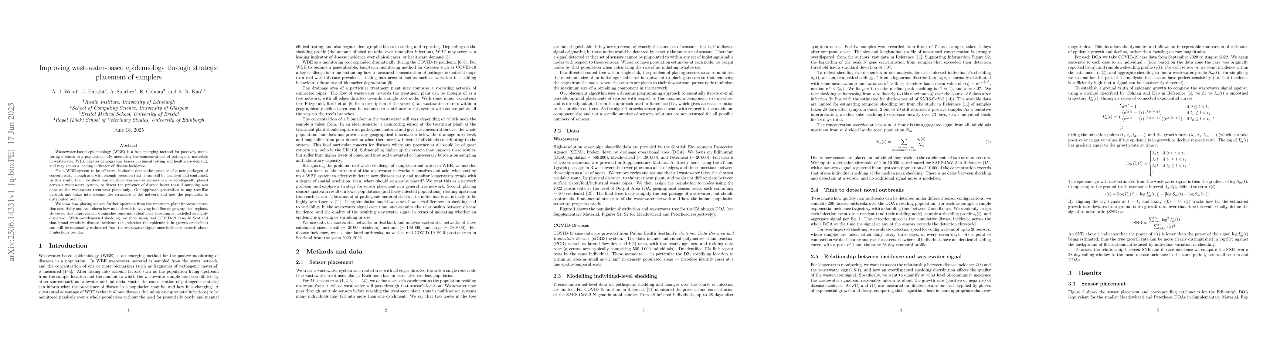 Wastewater-based epidemiology (WBE) is a fast emerging method for passively monitoring diseases in a population. By measuring the concentrations of pathogenic materials in wastewater, WBE negates demographic biases in clinical testing and healthcare demand, and may act as a leading indicator of disease incidence. For a WBE system to be effective, it should detect the presence of a new pathogen of concern early enough and with enough precision that it can still be localised and contained. In this study, then, we show how multiple wastewater sensors can be strategically placed across a wastewater system, to detect the presence of disease faster than if sampling was done at the wastewater treatment plant only. Our approach generalises to any tree-like network and takes into account the structure of the network and how the population is distributed over it. We show how placing sensors further upstream from the treatment plant improves detection sensitivity and can inform how an outbreak is evolving in different geographical regions. However, this improvement diminishes once individual-level shedding is modelled as highly dispersed. With overdispersed shedding, we show using real COVID-19 cases in Scotland that broad trends in disease incidence (i.e., whether the epidemic is in growth or decline) can still be reasonably estimated from the wastewater signal once incidence exceeds about 5 infections per day.