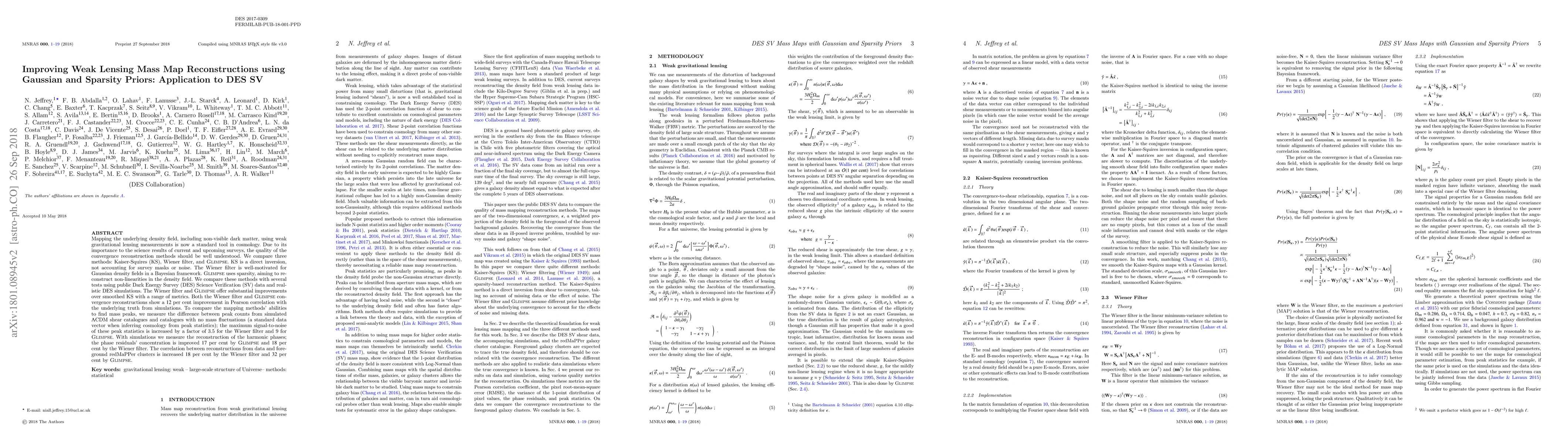 This paper compares three methods for weak lensing mass map reconstructions: Kaiser-Squires, Wiener filter, and GLIMPSE, using DES SV data. The Wiener filter and GLIMPSE show significant improvements over the KS method, with a 12% better Pearson correlation and a 3.5 to 9 times higher signal-to-noise in peak statistics.