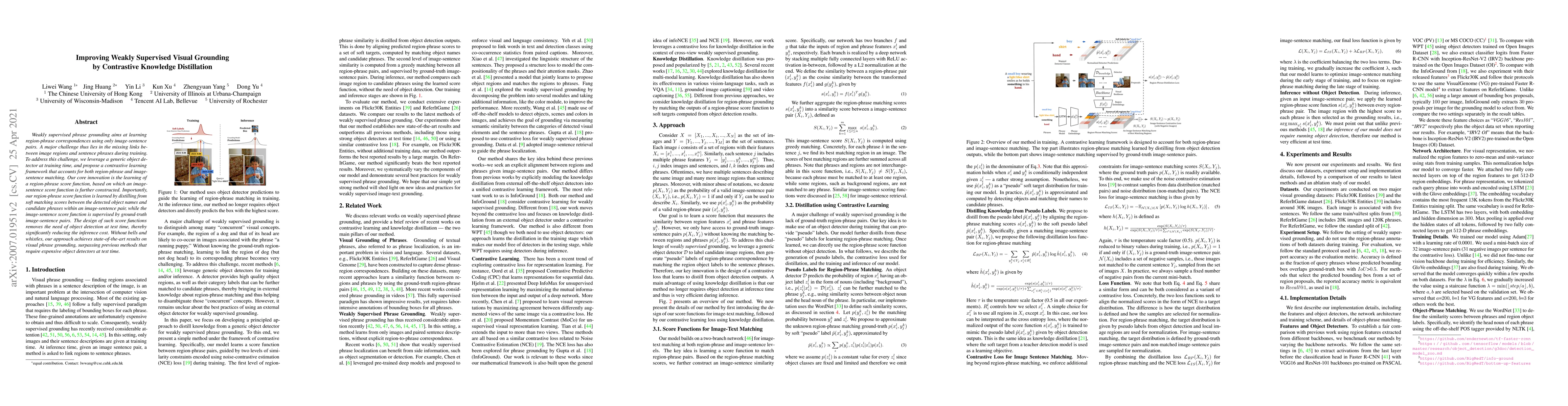This paper proposes a contrastive learning framework for weakly supervised visual phrase grounding, leveraging a generic object detector during training to learn region-phrase score functions. The method achieves state-of-the-art results by eliminating the need for object detection at test time, thus reducing inference costs.