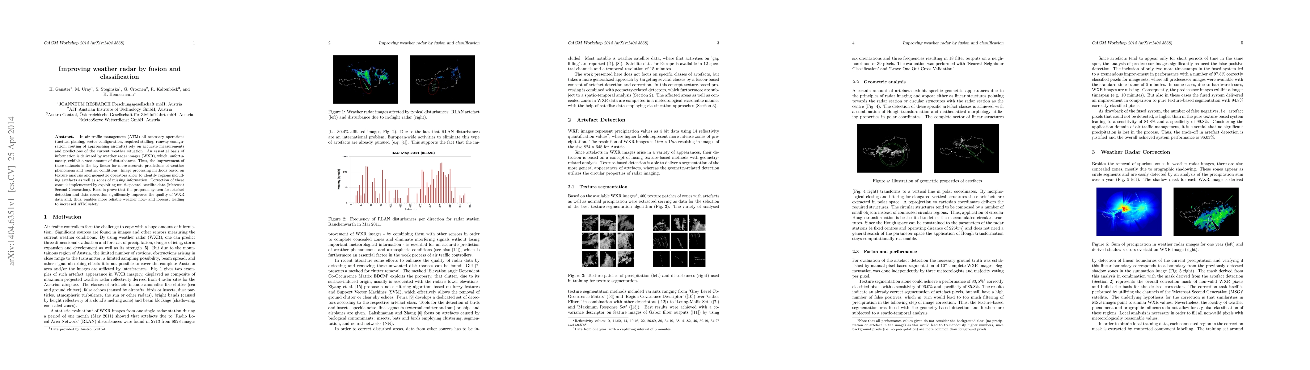 In air traffic management (ATM) all necessary operations (tactical planing, sector configuration, required staffing, runway configuration, routing of approaching aircrafts) rely on accurate measurements and predictions of the current weather situation. An essential basis of information is delivered by weather radar images (WXR), which, unfortunately, exhibit a vast amount of disturbances. Thus, the improvement of these datasets is the key factor for more accurate predictions of weather phenomena and weather conditions. Image processing methods based on texture analysis and geometric operators allow to identify regions including artefacts as well as zones of missing information. Correction of these zones is implemented by exploiting multi-spectral satellite data (Meteosat Second Generation). Results prove that the proposed system for artefact detection and data correction significantly improves the quality of WXR data and, thus, enables more reliable weather now- and forecast leading to increased ATM safety.