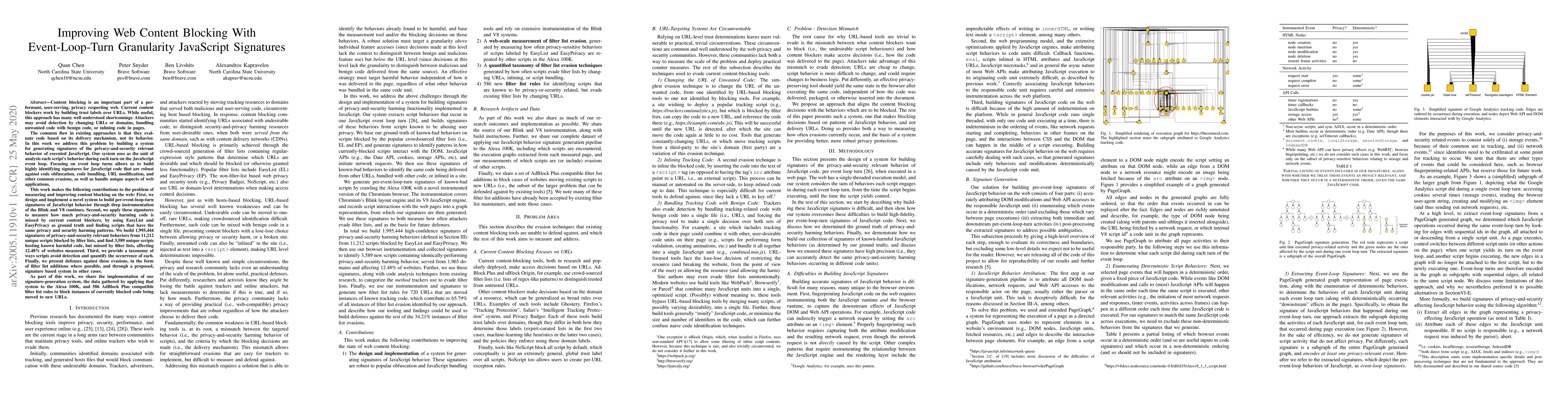 This paper proposes a novel system to generate signatures of JavaScript code based on its behavior during each turn of the event loop, aiming to improve web content blocking. The authors find that 12.48% of websites use scripts with identical harmful behaviors, despite changes in URLs or domains, and propose defenses including new filter list additions and a signature-based blocking system.