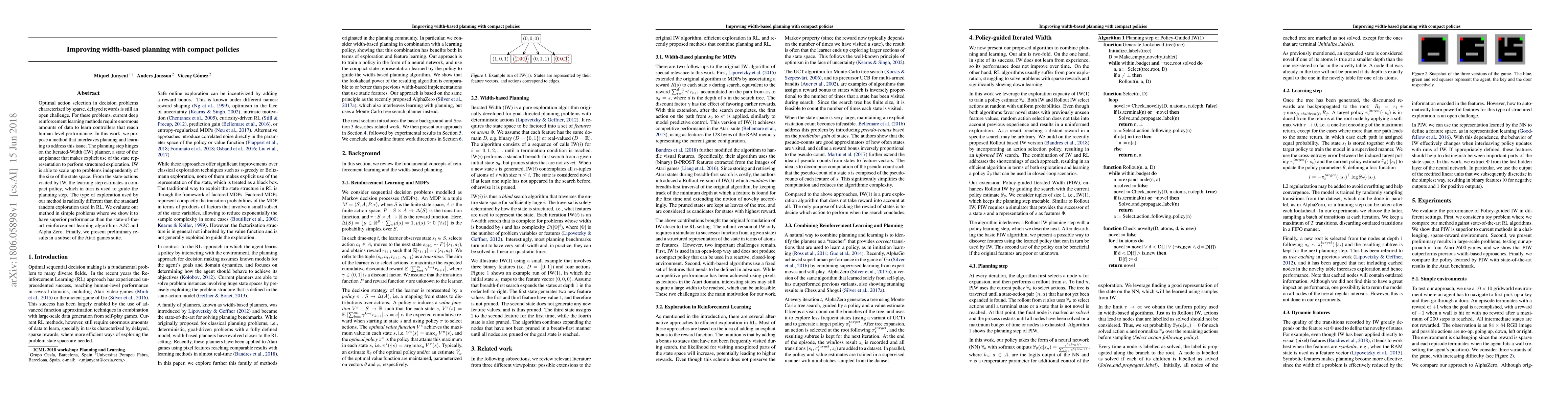 This paper proposes a novel method interleaving planning with learning to improve optimal action selection in decision problems with sparse, delayed rewards. It utilizes the Iterated-Width planner for structured exploration and a compact policy learned from planning states to guide future planning, achieving superior performance over A2C and Alpha Zero in simple problems and preliminary results in Atari games.