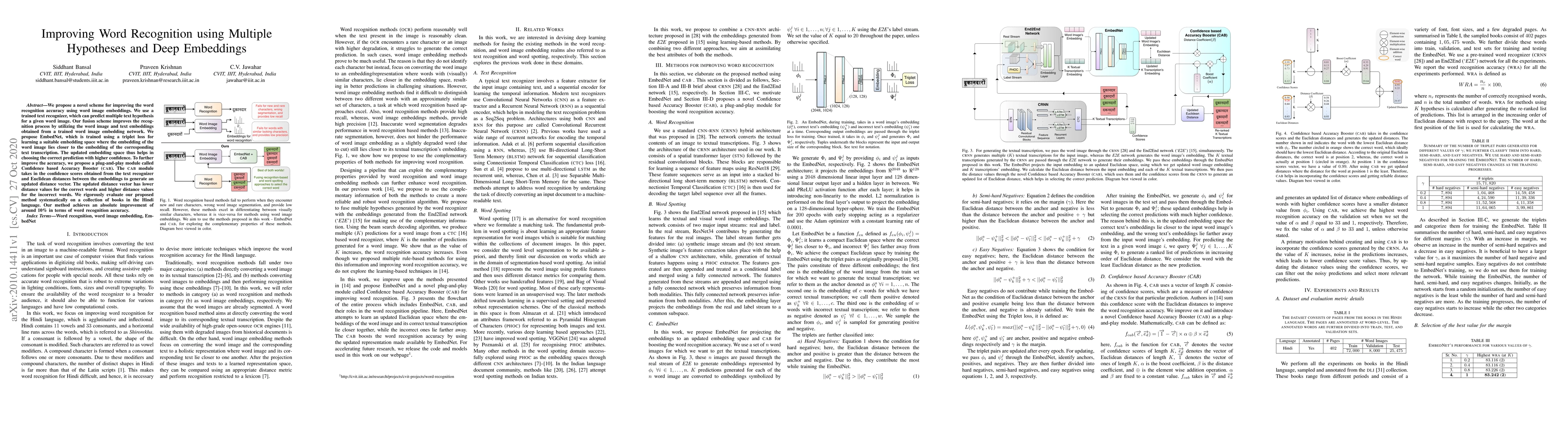 This paper proposes a method to enhance word recognition accuracy using multiple hypotheses and deep embeddings, employing a fusion scheme that leverages word image and text embeddings. The EmbedNet model, trained with a triplet loss, and the Confidence based Accuracy Booster (CAB) module improve recognition by refining the embedding space and updating distance vectors, achieving a 10% improvement in Hindi word recognition accuracy.