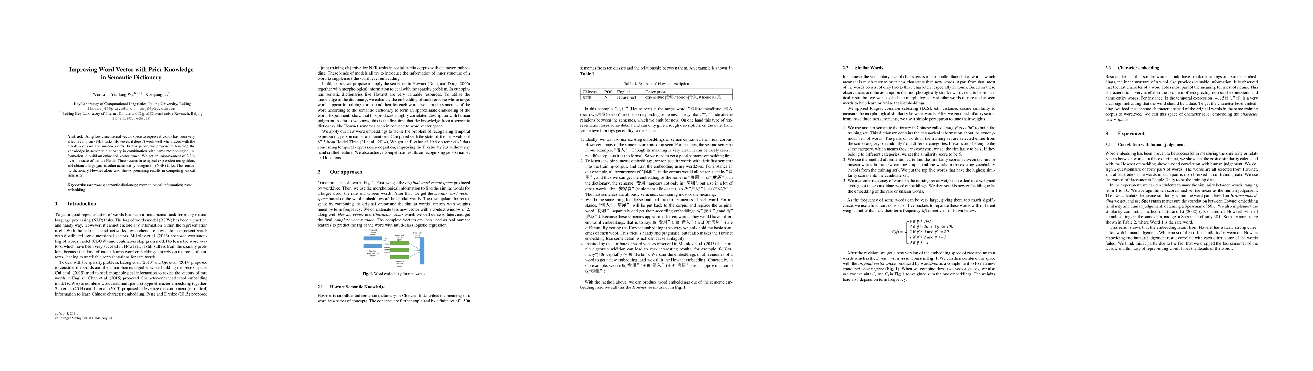 The paper proposes enhancing word vectors using prior knowledge from semantic dictionaries and morphological information, improving temporal expression recognition by 2.3% over existing systems and boosting other NER tasks. The semantic dictionary Hownet also demonstrates significant results in lexical similarity computations.
