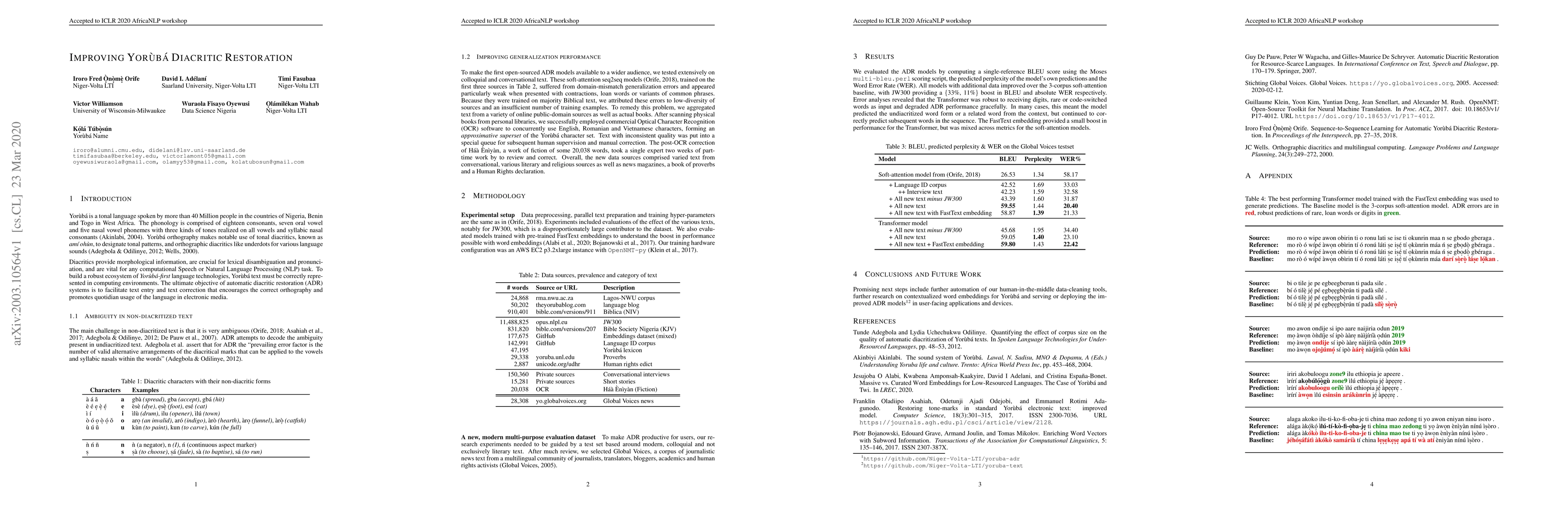 This paper discusses efforts to improve diacritic restoration for Yor\`ub\'a, a West African language, by expanding a dataset and evaluating updated models. The authors released pre-trained models, datasets, and source code to advance Yor\`ub\'a language technology.