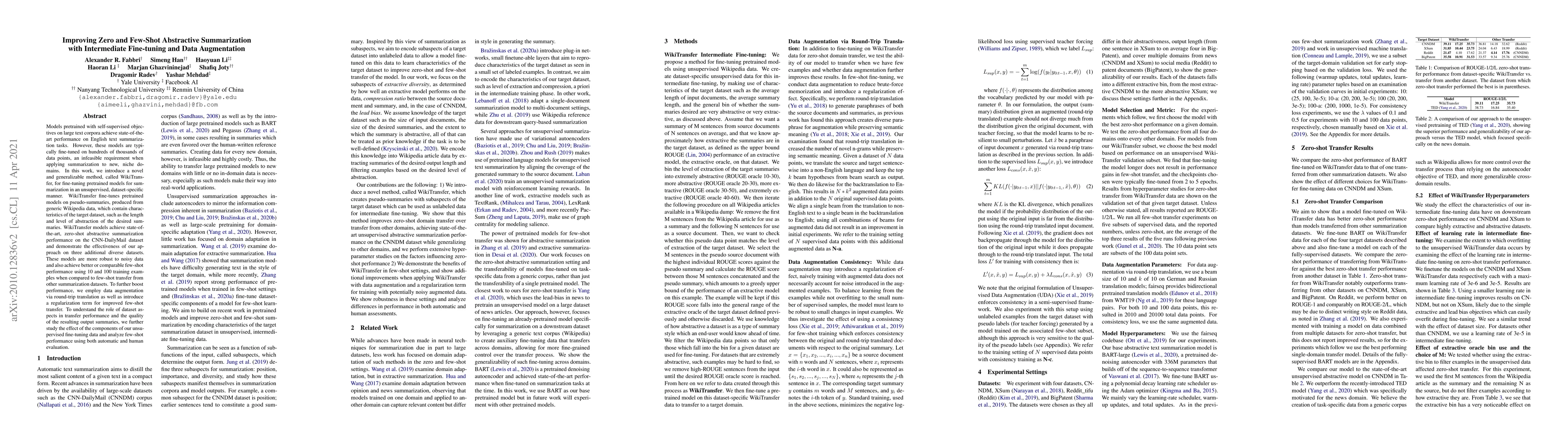 This paper proposes WikiTransfer, a method for fine-tuning pretrained models for zero and few-shot abstractive summarization using unsupervised, dataset-specific pseudo-summaries from Wikipedia. The approach achieves state-of-the-art performance on multiple datasets and demonstrates robustness to noisy data and improved few-shot learning capabilities.