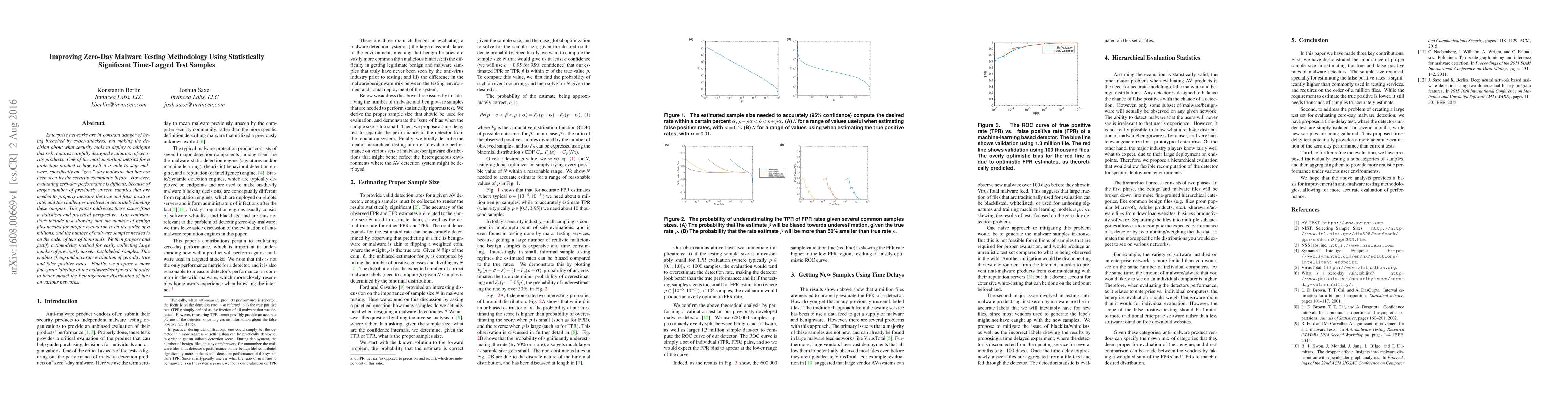 This paper proposes a statistically significant time-lagged test sample methodology to improve the evaluation of zero-day malware detection tools. It highlights the need for millions of benign and tens of thousands of malware samples for accurate assessment and introduces a time-delay method to collect these samples, enabling better modeling of network file distributions.