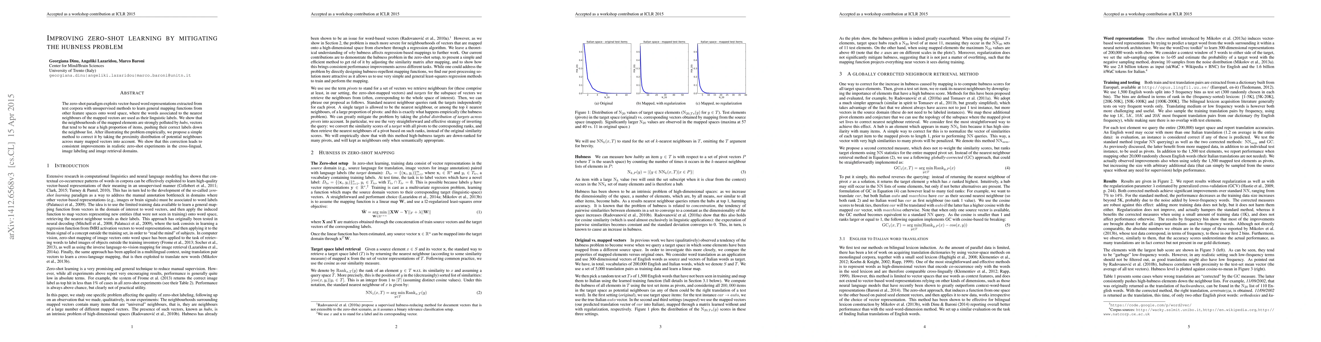 The zero-shot paradigm exploits vector-based word representations extracted from text corpora with unsupervised methods to learn general mapping functions from other feature spaces onto word space, where the words associated to the nearest neighbours of the mapped vectors are used as their linguistic labels. We show that the neighbourhoods of the mapped elements are strongly polluted by hubs, vectors that tend to be near a high proportion of items, pushing their correct labels down the neighbour list. After illustrating the problem empirically, we propose a simple method to correct it by taking the proximity distribution of potential neighbours across many mapped vectors into account. We show that this correction leads to consistent improvements in realistic zero-shot experiments in the cross-lingual, image labeling and image retrieval domains.