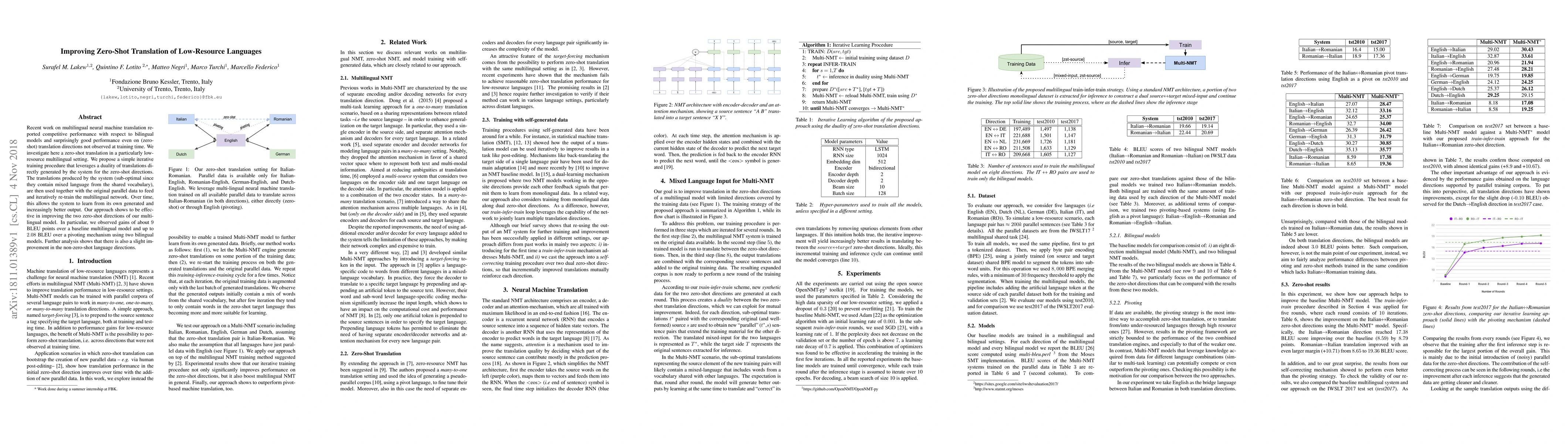 This paper proposes an iterative training method to enhance zero-shot translation for low-resource languages in multilingual neural machine translation, achieving a 9 BLEU point improvement over a baseline model and a 2.08 BLEU point gain over a pivoting mechanism. The method leverages self-generated translations to iteratively retrain the model, also showing slight improvements in non-zero-shot directions.