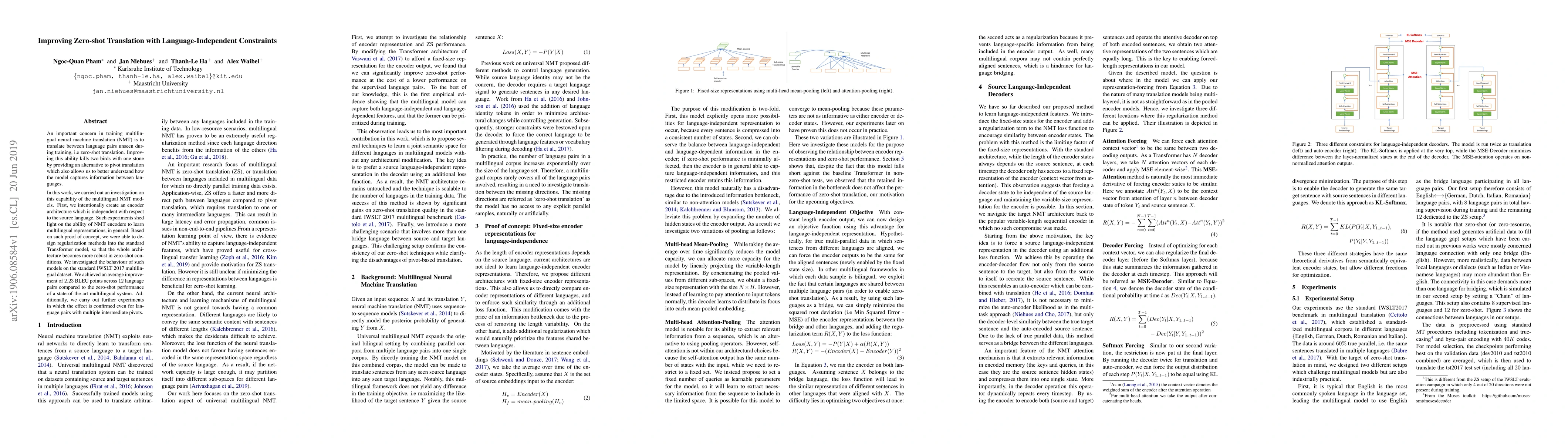 This paper investigates methods to enhance zero-shot translation in multilingual neural machine translation (NMT) by creating language-independent encoders and introducing regularization techniques into the Transformer model. The proposed approach led to an average 2.23 BLEU point improvement across 12 language pairs on the IWSLT 2017 dataset.