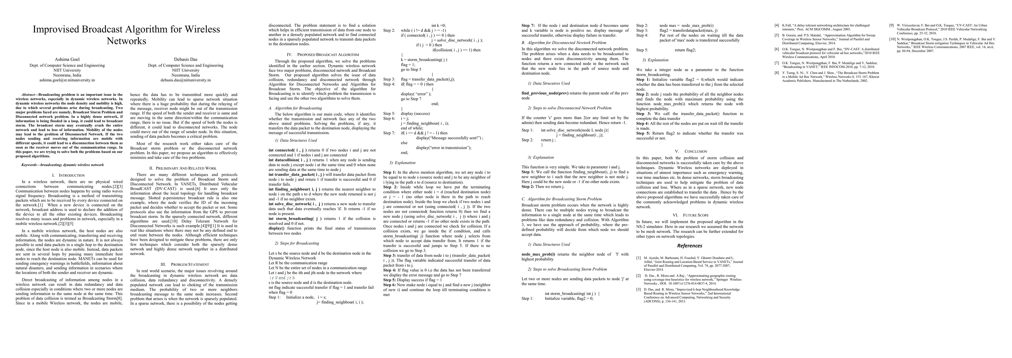 This paper proposes an improvised broadcast algorithm to tackle the Broadcast Storm Problem and Disconnected Network Problem in dynamic wireless networks, aiming to enhance network stability and information delivery despite high node density and mobility.