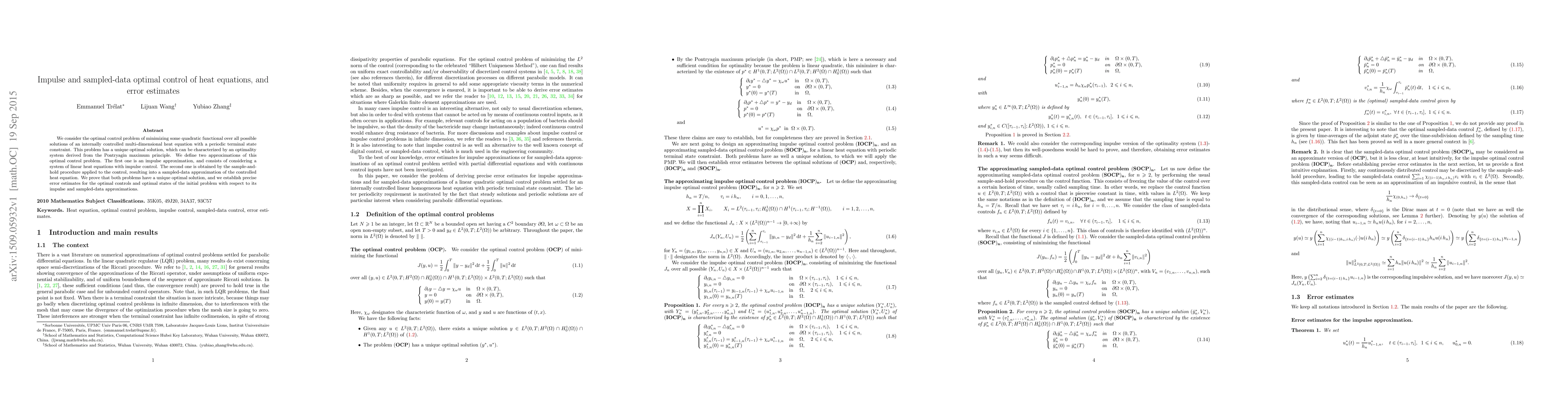 This paper addresses the optimal control of multi-dimensional heat equations with periodic terminal constraints, deriving an optimality system using the Pontryagin maximum principle. It introduces impulse and sampled-data approximations of the optimal control problem, proving unique solvability for both and providing precise error estimates for the approximations.