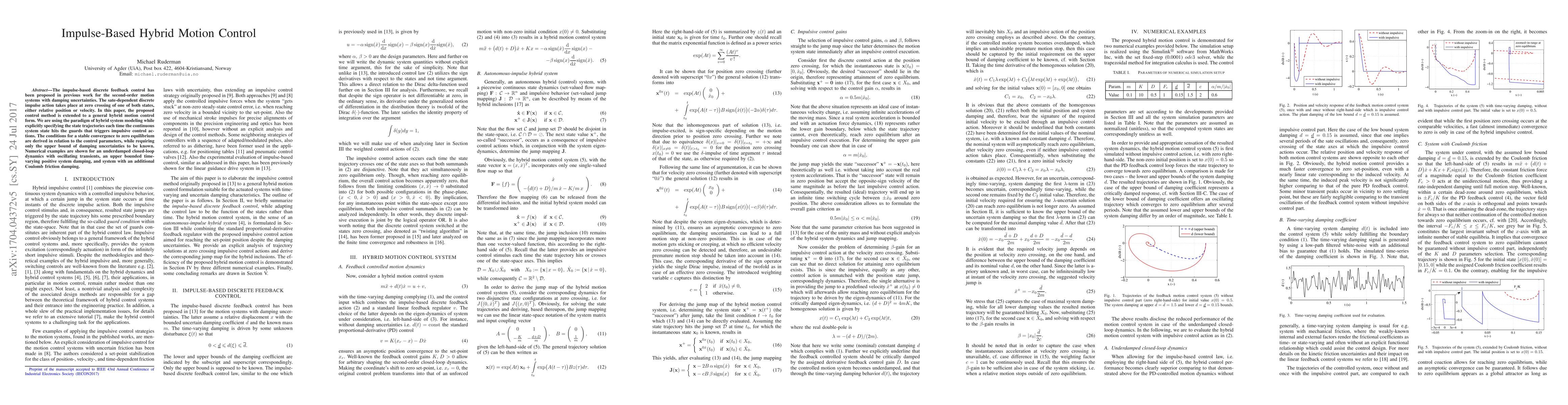 The impulse-based discrete feedback control has been proposed in previous work for the second-order motion systems with damping uncertainties. The sate-dependent discrete impulse action takes place at zero crossing of one of both states, either relative position or velocity. In this paper, the proposed control method is extended to a general hybrid motion control form. We are using the paradigm of hybrid system modeling while explicitly specifying the state trajectories each time the continuous system state hits the guards that triggers impulsive control actions. The conditions for a stable convergence to zero equilibrium are derived in relation to the control parameters, while requiring only the upper bound of damping uncertainties to be known. Numerical examples are shown for an underdamped closed-loop dynamics with oscillating transients, an upper bounded time-varying positive system damping, and system with an additional Coulomb friction damping.