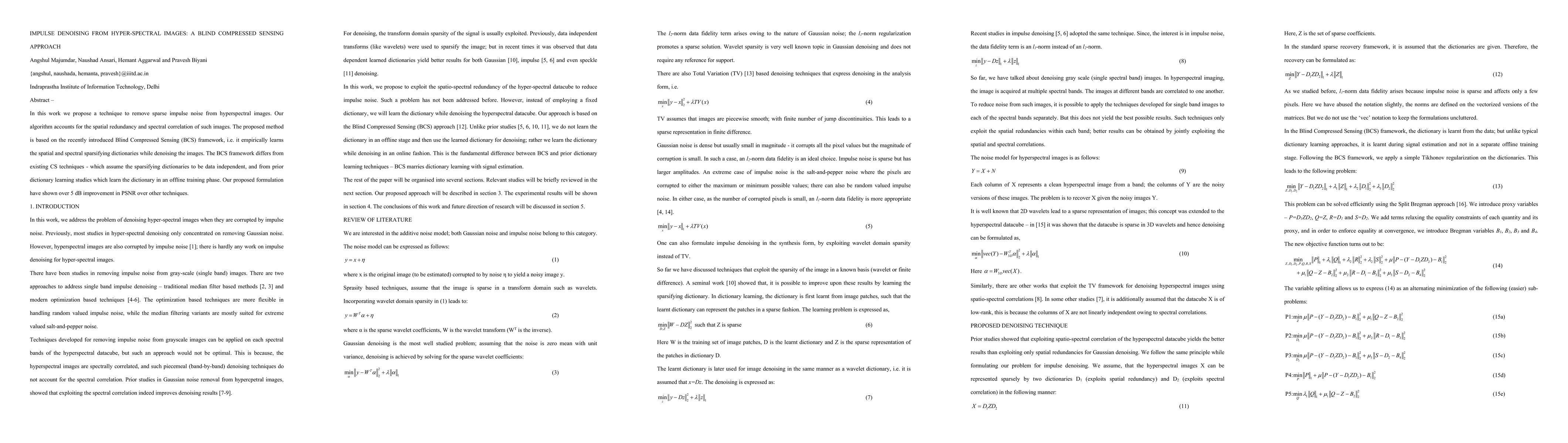 In this work we propose a technique to remove sparse impulse noise from hyperspectral images. Our algorithm accounts for the spatial redundancy and spectral correlation of such images. The proposed method is based on the recently introduced Blind Compressed Sensing (BCS) framework, i.e. it empirically learns the spatial and spectral sparsifying dictionaries while denoising the images. The BCS framework differs from existing CS techniques - which assume the sparsifying dictionaries to be data independent, and from prior dictionary learning studies which learn the dictionary in an offline training phase. Our proposed formulation have shown over 5 dB improvement in PSNR over other techniques.