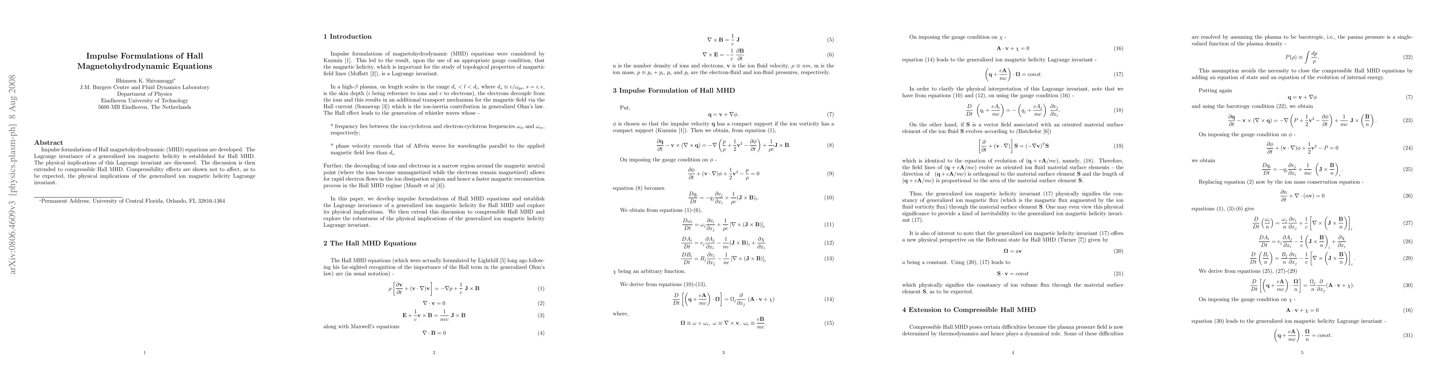This paper develops impulse formulations for Hall magnetohydrodynamic (MHD) equations and establishes the Lagrange invariance of a generalized ion magnetic helicity. It discusses the physical implications of this invariant and extends the analysis to compressible Hall MHD, showing that compressibility does not affect the invariant's significance.