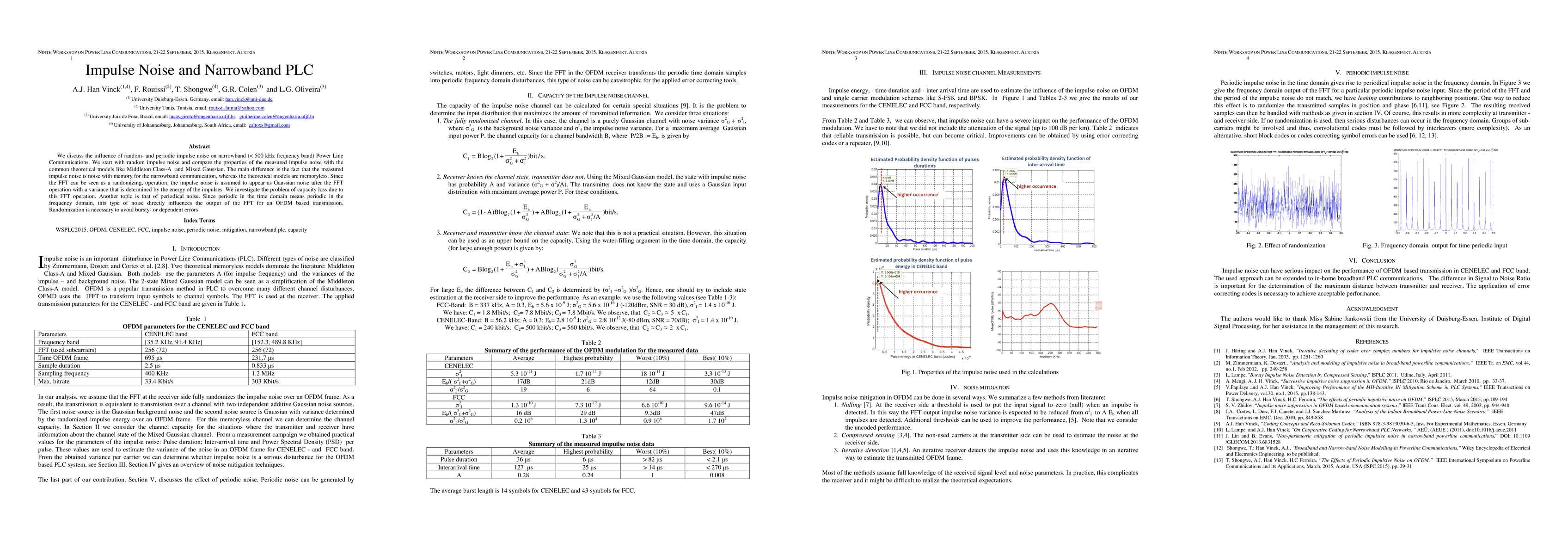 We discuss the influence of random- and periodic impulse noise on narrowband (< 500 kHz frequency band) Power Line Communications. We start with random impulse noise and compare the properties of the measured impulse noise with the common theoretical models like Middleton Class-A and Mixed Gaussian. The main difference is the fact that the measured impulse noise is noise with memory for the narrowband communication, whereas the theoretical models are memoryless. Since the FFT can be seen as a randomizing, operation, the impulse noise is assumed to appear as Gaussian noise after the FFT operation with a variance that is determined by the energy of the impulses. We investigate the problem of capacity loss due to this FFT operation. Another topic is that of periodical noise. Since periodic in the time domain means periodic in the frequency domain, this type of noise directly influences the output of the FFT for an OFDM based transmission. Randomization is necessary to avoid bursty- or dependent errors.