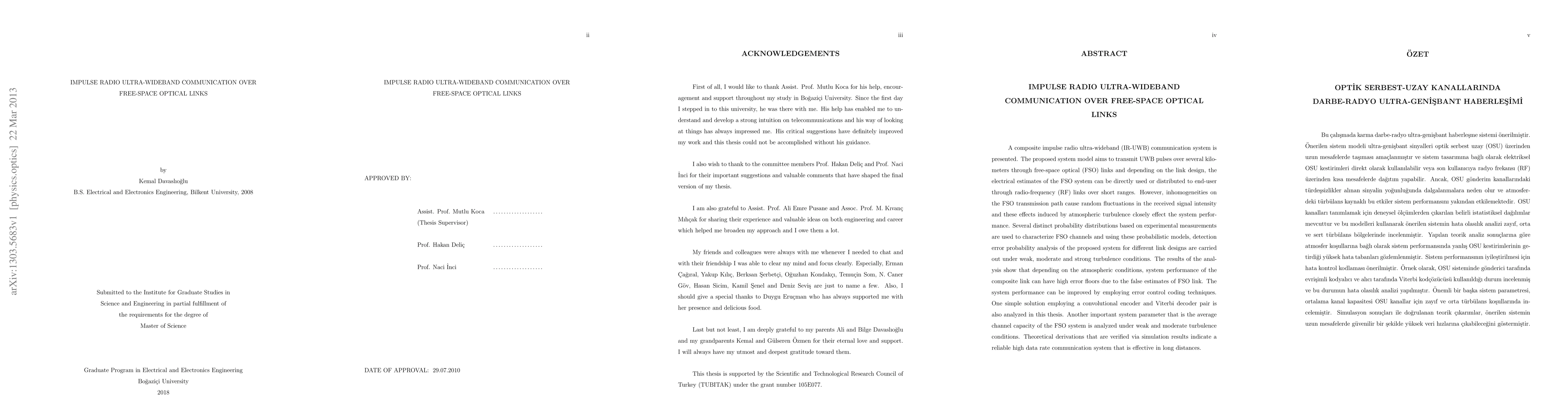 A composite impulse radio ultra-wideband (IR-UWB) communication system is presented. The proposed system model aims to transmit UWB pulses over several kilometers through free-space optical (FSO) links and depending on the link design, the electrical estimates of the FSO system can be directly used or distributed to end-user through radio-frequency (RF) links over short ranges. However, inhomogeneities on the FSO transmission path cause random fluctuations in the received signal intensity and these effects induced by atmospheric turbulence closely effect the system performance. Several distinct probability distributions based on experimental measurements are used to characterize FSO channels and using these probabilistic models, detection error probability analysis of the proposed system for different link designs are carried out under weak, moderate and strong turbulence conditions. The results of the analysis show that depending on the atmospheric conditions, system performance of the composite link can have high error floors due to the false estimates of FSO link. The system performance can be improved by employing error control coding techniques. One simple solution employing a convolutional encoder and Viterbi decoder pair is also analyzed in this thesis. Another important system parameter that is the average channel capacity of the FSO system is analyzed under weak and moderate turbulence conditions. Theoretical derivations that are verified via simulation results indicate a reliable high data rate communication system that is effective in long distances.