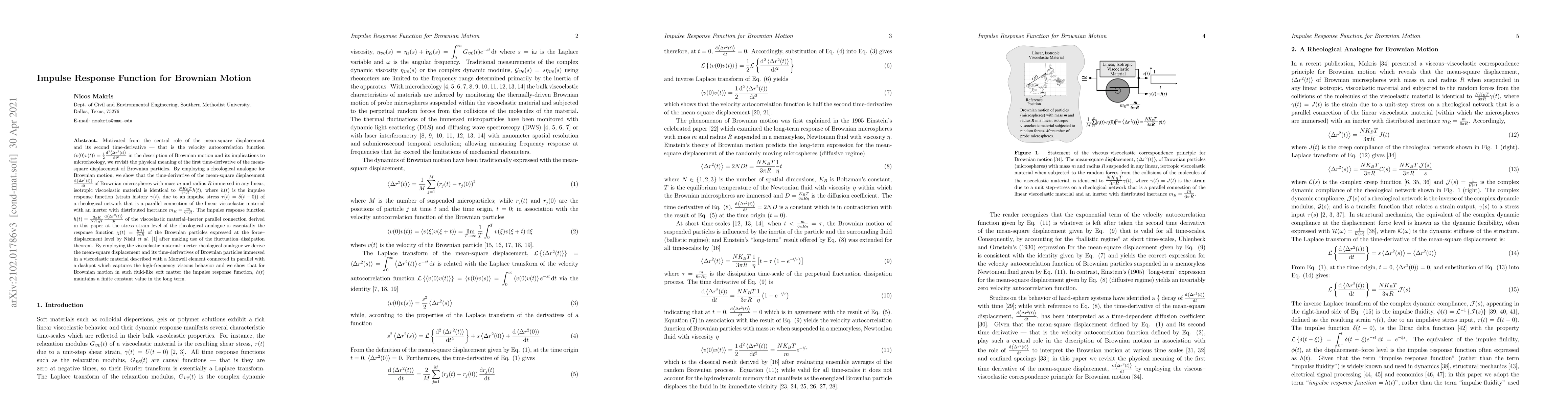 Motivated from the central role of the mean-square displacement and its second time-derivative -- that is the velocity autocorrelation function $\left\langle v(0)v(t)\right\rangle=\frac{1}{2} \frac{\mathrm{d}^{2} \left\langle \Delta r^{2} (t)\right\rangle}{\mathrm{d}t^{2}} $ in the description of Brownian motion, we revisit the physical meaning of the first time-derivative of the mean-square displacement of Brownian particles. By employing a rheological analogue for Brownian motion, we show that the time-derivative of the mean-square displacement $\frac{\mathrm{d}\left\langle \Delta r^{2} (t) \right\rangle}{\mathrm{d}t}$ of Brownian microspheres with mass $m$ and radius $R$ immersed in any linear, isotropic viscoelastic material is identical to $\frac{N K_B T}{3 \pi R}h(t)$, where $h(t)$ is the impulse response function of a rheological network that is a parallel connection of the linear viscoelastic material with an inerter with distributed inertance $m_R=\frac{m}{6 \pi R}$. The impulse response function $h(t)=\frac{3\pi R}{N K_B T}\frac{\mathrm{d}\left\langle \Delta r^{2} (t) \right\rangle}{\mathrm{d}t}$ of the viscoelastic material-inerter parallel connection derived in this paper at the stress-strain level of the rheological analogue is essentially the response function $\chi(t)=\frac{h(t)}{6\pi R}$ of the Brownian particles expressed at the force-displacement level by Nishi \textit{et al.} (2018). By employing the viscoelastic material-inerter rheological analogue we derive the mean-square displacement and its time-derivatives of Brownian particles immersed in a viscoelastic material described with a Maxwell element connected in parallel with a dashpot which captures the high-frequency viscous behavior and we show that for Brownian motion in such fluid-like soft matter the impulse response function, $h(t)$ maintains a finite constant value in the long term.