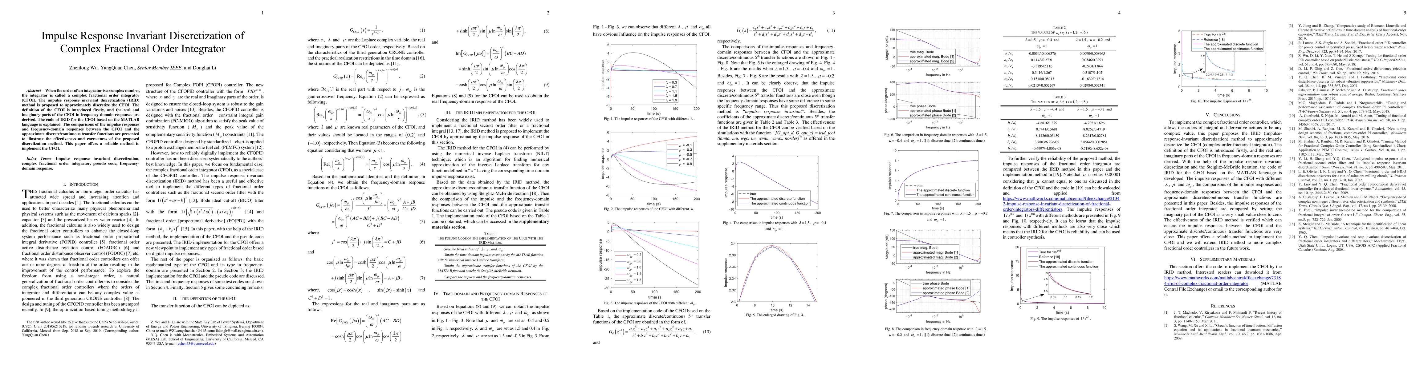 When the order of an integrator is a complex number, the integrator is called a complex fractional order integrator (CFOI). The impulse response invariant discretization (IRID) method is proposed to approximately discretize the CFOI. The definition of the CFOI is introduced firstly, and the real and imaginary parts of the CFOI in frequency-domain responses are derived. The code of IRID for the CFOI based on the MATLAB language is explained. The comparisons of the impulse responses and frequency-domain responses between the CFOI and the approximate discrete/continuous transfer functions are presented to illustrate the effectiveness and correctness of the proposed discretization method. This paper offers a reliable method to implement the CFOI.