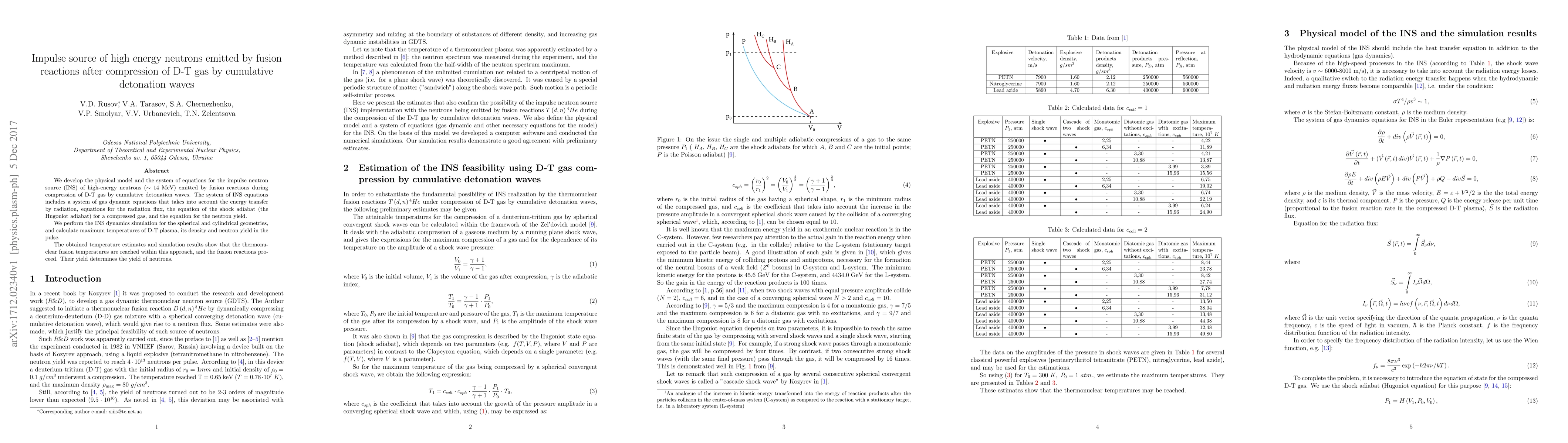 We develop the physical model and the system of equations for the impulse neutron source (INS) of high-energy neutrons ($\sim$14 MeV) emitted by fusion reactions during compression of D-T gas by cumulative detonation waves. The system of INS equations includes a system of gas dynamic equations that takes into account the energy transfer by radiation, equations for the radiation flux, the equation of the shock adiabat (the Hugoniot adiabat) for a compressed gas, and the equation for the neutron yield. We perform the INS dynamics simulation for the spherical and cylindrical geometries, and calculate maximum temperatures of D-T plasma, its density and neutron yield in the pulse. The obtained temperature estimates and simulation results show that the thermonuclear fusion temperatures are reached within this approach, and the fusion reactions proceed. Their yield determines the yield of neutrons.