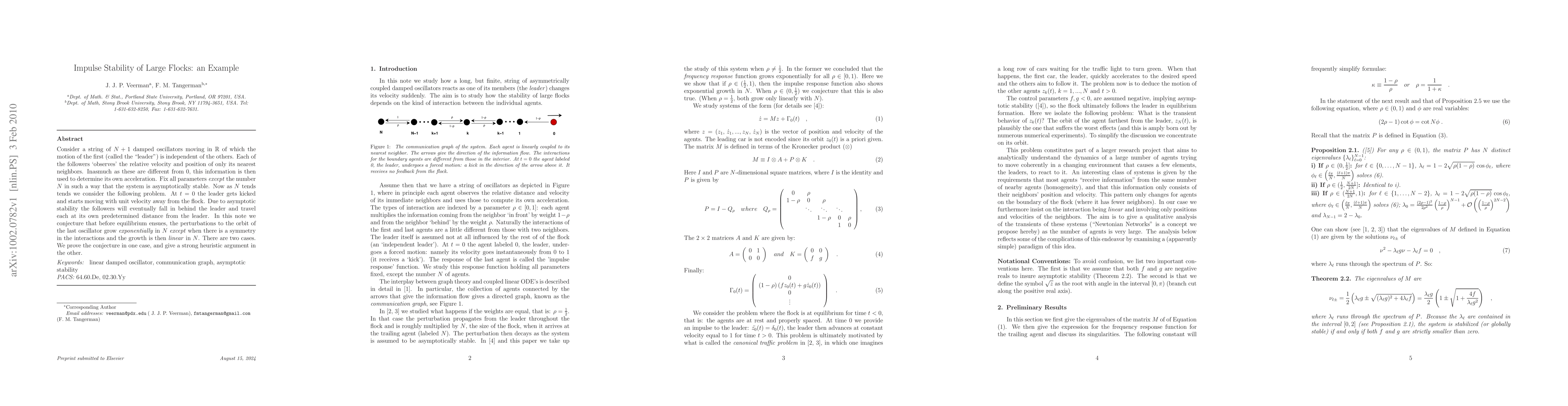 Consider a string of N+1 damped oscillators moving on the line of which the motion of the first (called the "leader") is independent of the others. Each of the followers `observes' the relative velocity and position of only its nearest neighbors. Inasmuch as these are different from 0, this information is then used to determine its own acceleration. Fix all parameters except the number N in such a way that the system is asymptotically stable. Now as N tends tends we consider the following problem. At t=0 the leader gets kicked and starts moving with unit velocity away from the flock. Due to asymptotic stability the followers will eventually fall in behind the leader and travel each at its own predetermined distance from the leader. In this note we conjecture that before equilibrium ensues, the perturbations to the orbit of the last oscillator grow exponentially in N except when there is a symmetry in the interactions and the growth is then linear in N. There are two cases. We prove the conjecture in one case, and give a strong heuristic argument in the other.