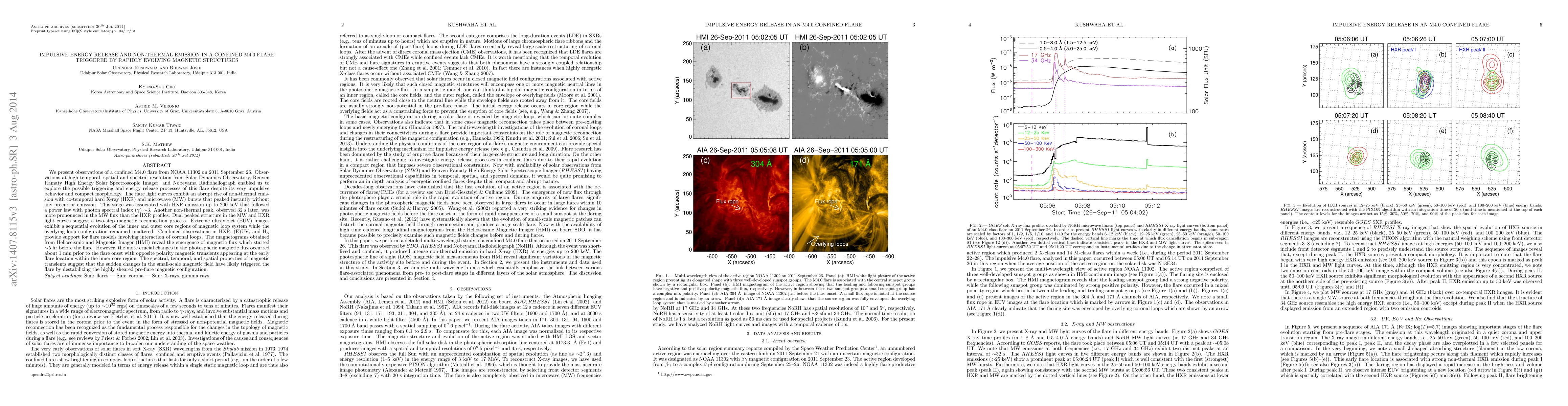 We present observations of a confined M4.0 flare from NOAA 11302 on 2011 September 26. Observations at high temporal, spatial, and spectral resolution from Solar Dynamics Observatory, Reuven Ramaty High Energy Solar Spectroscopic Imager, and Nobeyama Radioheliograph enabled us to explore the possible triggering and energy release processes of this flare despite its very impulsive behavior and compact morphology. The flare light curves exhibit an abrupt rise of non-thermal emission with co-temporal hard X-ray (HXR) and microwave (MW) bursts that peaked instantly without any precursor emission. This stage was associated with HXR emission up to 200 keV that followed a power law with photon spectral index ($\delta$) $\sim$3. Another non-thermal peak, observed 32 s later, was more pronounced in the MW flux than the HXR profiles. Dual peaked structure in the MW and HXR light curves suggest a two-step magnetic reconnection process. Extreme ultraviolet (EUV) images exhibit a sequential evolution of the inner and outer core regions of magnetic loop system while the overlying loop configuration remained unaltered. Combined observations in HXR, (E)UV, and H$\alpha$ provide support for flare models involving interaction of coronal loops. The magnetograms obtained from Helioseismic and Magnetic Imager (HMI) reveal the emergence of magnetic flux which started $\sim$5 hr before the flare. However, the more crucial changes in the photospheric magnetic flux occurred about 1 minute prior to the flare onset with opposite polarity magnetic transients appearing at the early flare location within the inner core region. The spectral, temporal, and spatial properties of magnetic transients suggest that the sudden changes in the small-scale magnetic field have likely triggered the flare by destabilizing the highly sheared pre-flare magnetic configuration.