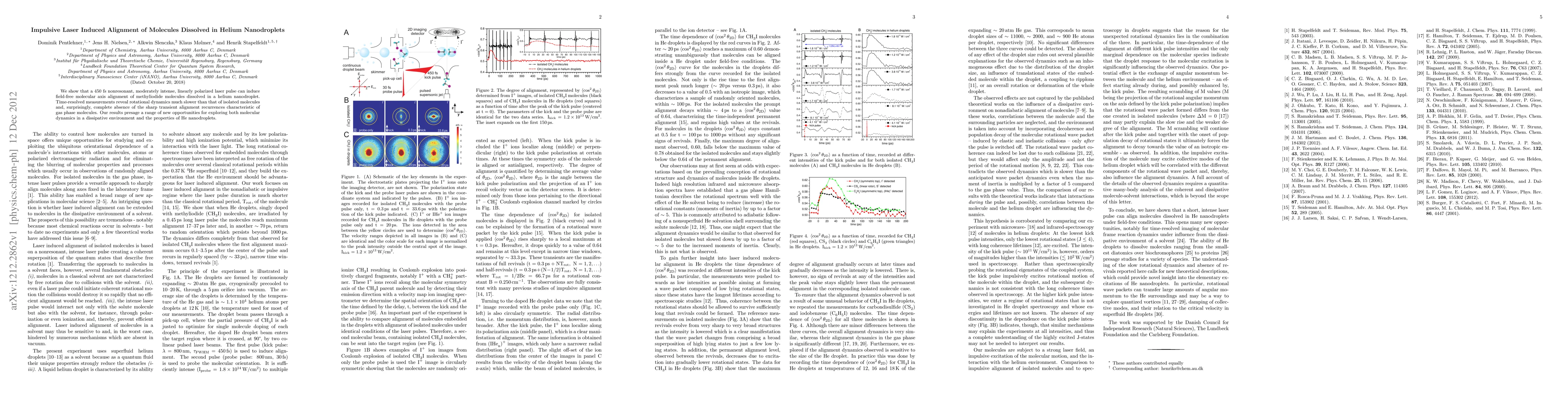 This study demonstrates that a short, polarized laser pulse can align the axes of methyliodide molecules in helium nanodroplets without external fields. The observed rotational dynamics are slower than those of isolated gas phase molecules, indicating unique behavior in this dissipative environment.