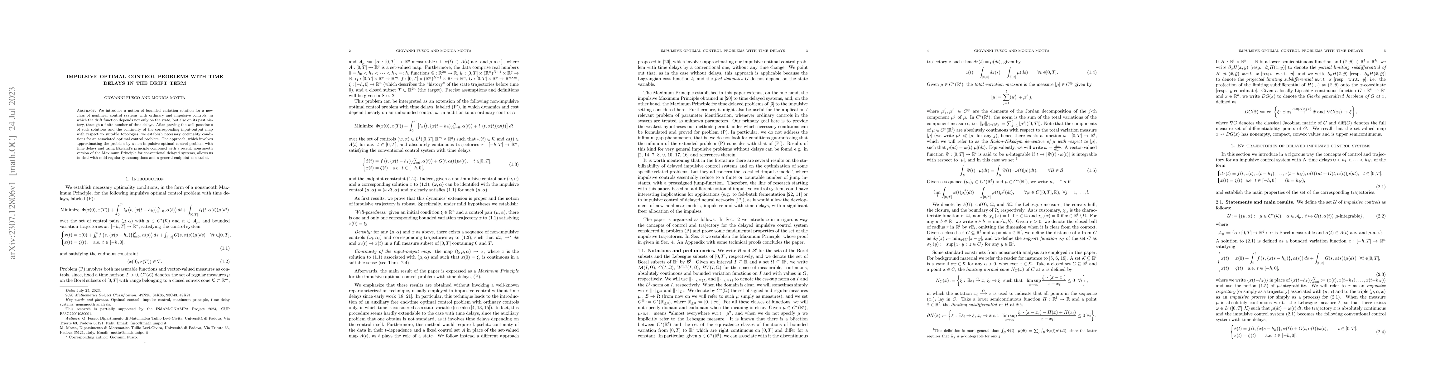 This paper develops a bounded variation solution for nonlinear control systems with impulsive controls and time delays in the drift term, proving well-posedness and continuity. It establishes necessary optimality conditions for the optimal control problem using an approach that combines Ekeland's principle and a nonsmooth Maximum Principle.