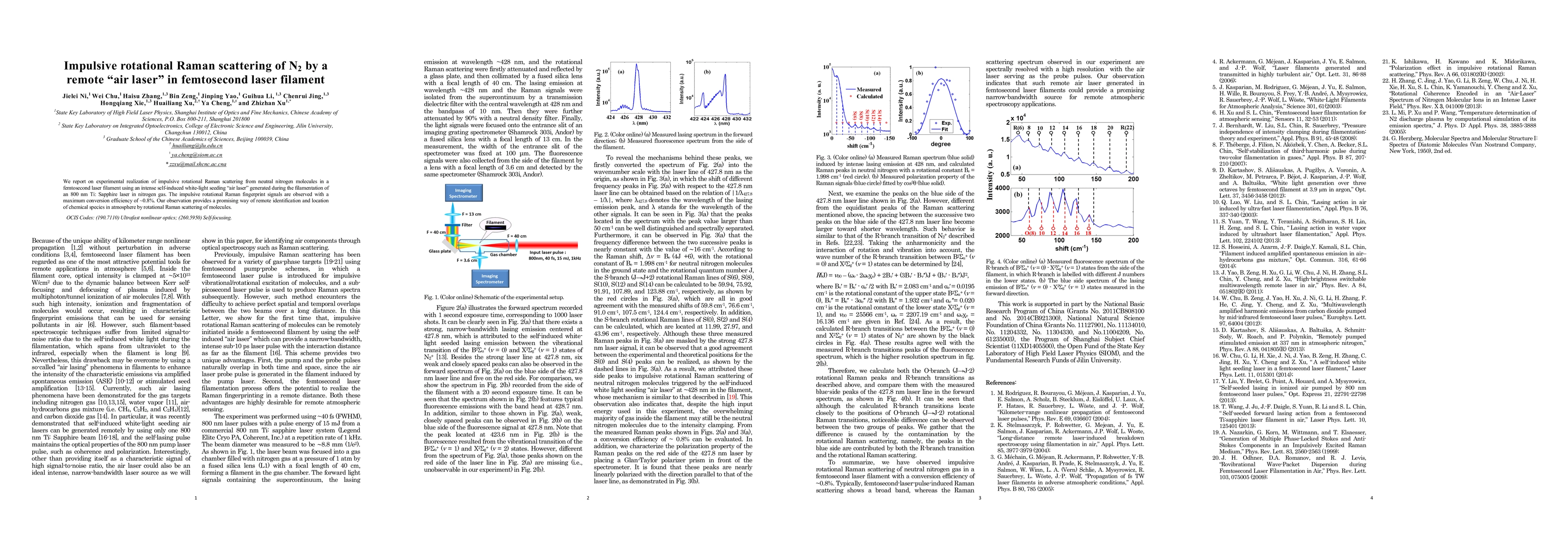 This paper reports on the experimental observation of impulsive rotational Raman scattering from nitrogen molecules using a femtosecond laser filament, achieving a conversion efficiency of ~0.8%. This method offers a potential technique for remote identification and location of chemical species in the atmosphere.