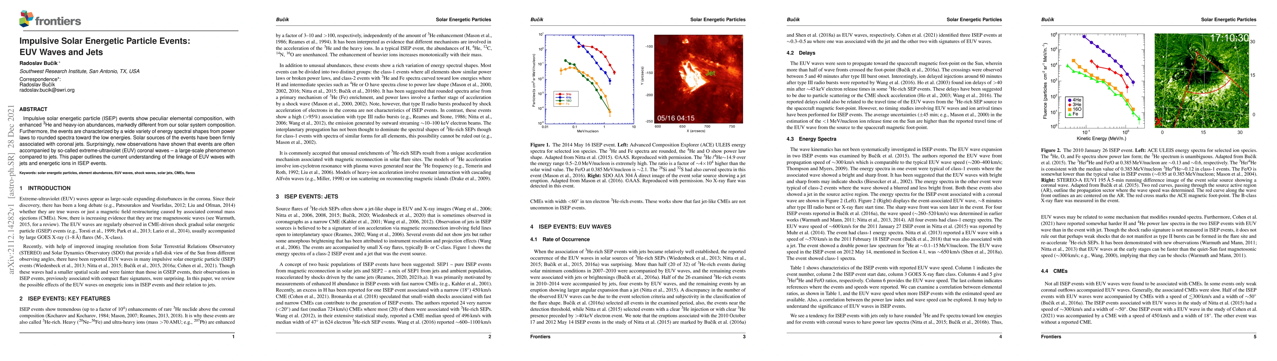 This paper investigates impulsive solar energetic particle (ISEP) events, noting their unique elemental composition and variable energy spectra, and explores the association between these events and coronal jets, alongside newly observed extreme-ultraviolet (EUV) coronal waves. The study aims to clarify the relationship between EUV waves, jets, and the acceleration of energetic ions in ISEP events.
