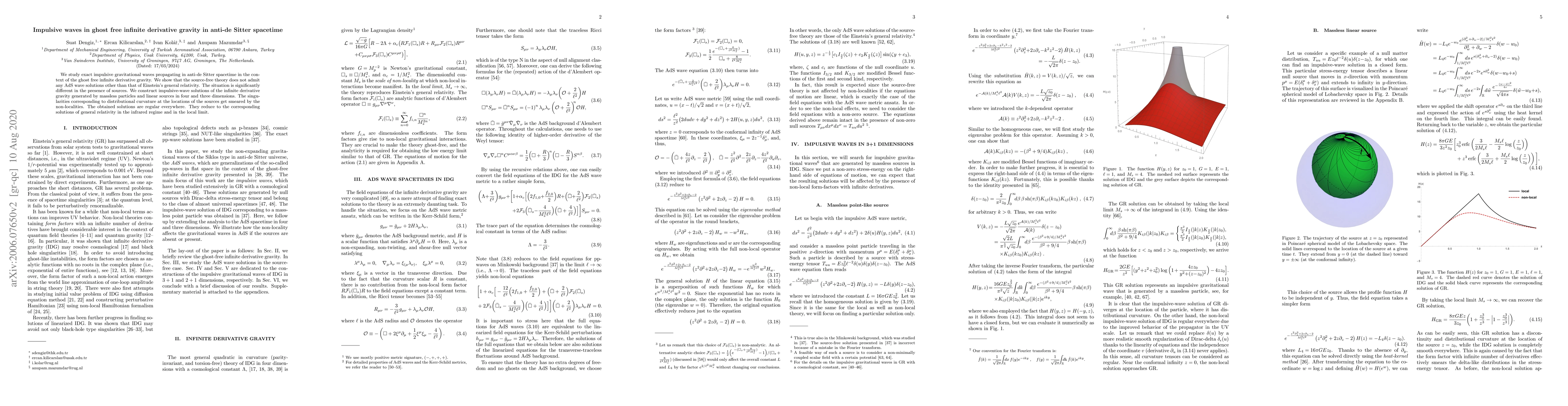 We study exact impulsive gravitational waves propagating in anti-de Sitter spacetime in the context of the ghost free infinite derivative gravity. We show that the source-free theory does not admit any AdS wave solutions other than that of Einstein's general relativity. The situation is significantly different in the presence of sources. We construct impulsive-wave solutions of the infinite derivative gravity generated by massless particles and linear sources in four and three dimensions. The singularities corresponding to distributional curvature at the locations of the sources get smeared by the non-localities. The obtained solutions are regular everywhere. They reduce to the corresponding solutions of general relativity in the infrared regime and in the local limit.
