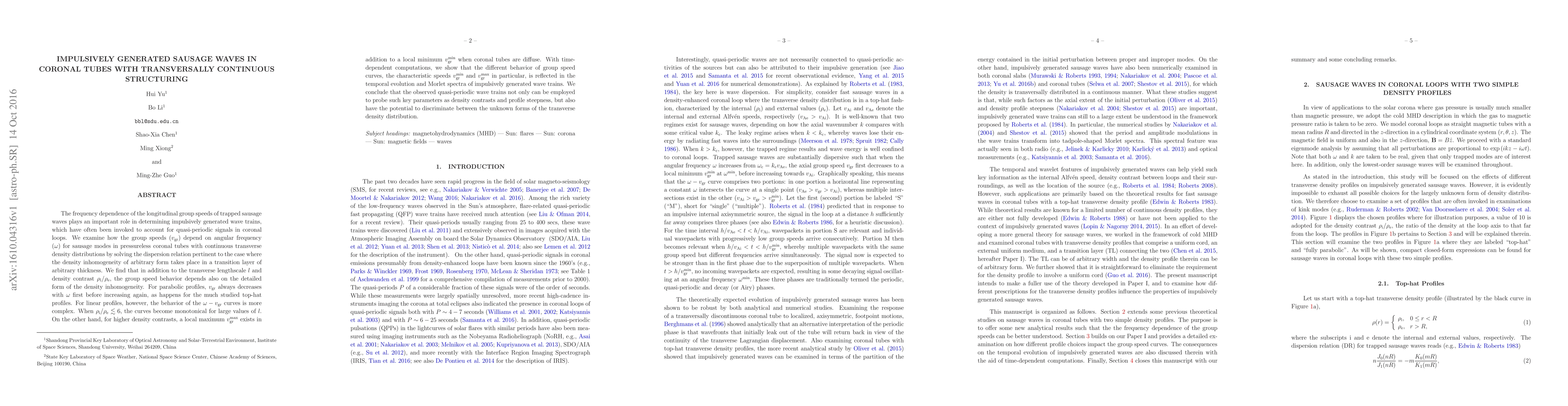 This paper investigates how the longitudinal group speeds of impulsively generated sausage waves in coronal tubes depend on angular frequency, revealing that the detailed form of transverse density inhomogeneity significantly influences the group speed behavior, which can help probe the density contrasts and profile steepness in coronal loops.