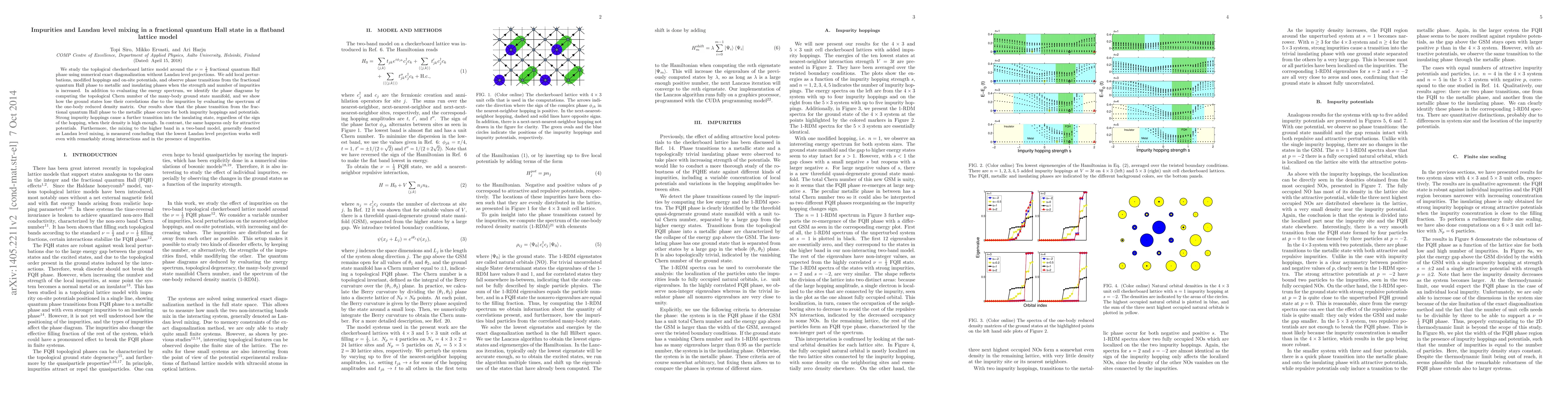 The study uses numerical exact diagonalization to analyze the topological checkerboard lattice model at the $ u=1/3$ fractional quantum Hall phase, introducing local perturbations like impurities and hoppings. Results indicate phase transitions from the FQH phase to metallic and insulating phases with increased impurity strength and count. The topological Chern number and one-body reduced density matrix are used to identify phase diagrams and assess correlation loss. The research shows that both impurity hoppings and potentials can cause transitions, with strong hoppings leading to insulating states regardless of sign at high density, and attractive potentials only. Landau level mixing is also measured, confirming the effectiveness of lowest Landau level projection even with strong interactions and impurities.