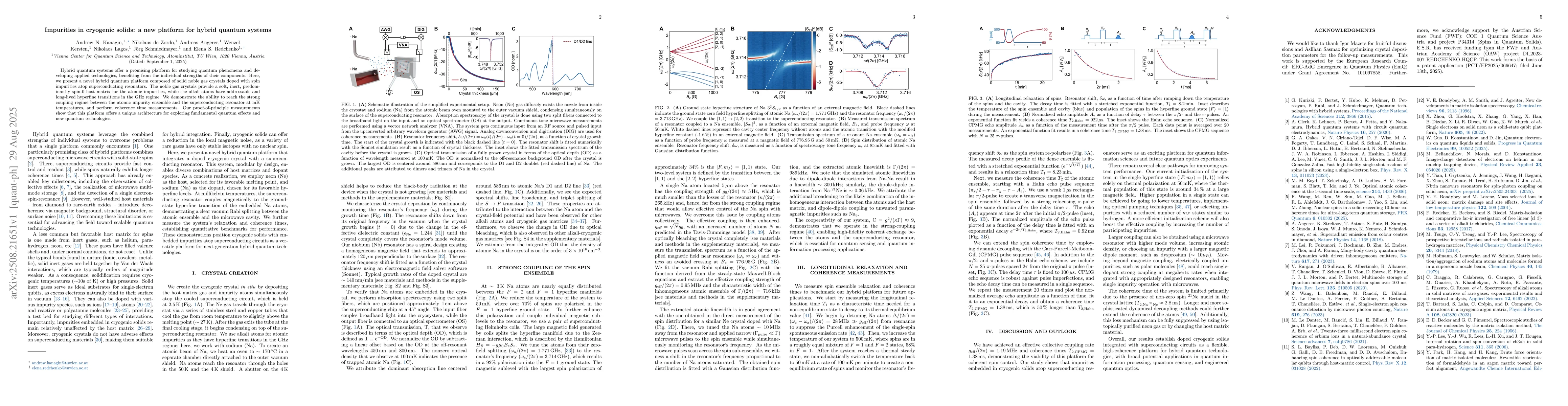 Hybrid quantum systems offer a promising platform for studying quantum phenomena and developing applied technologies, benefiting from the individual strengths of their components. Here, we present a novel hybrid quantum platform composed of solid noble gas crystals doped with spin impurities atop superconducting resonators. The noble gas crystals provide a soft, inert, predominantly spin-0 host matrix for the atomic impurities, while the alkali atoms have addressable and long-lived hyperfine transitions in the GHz regime. We demonstrate the ability to reach the strong coupling regime between the atomic impurity ensemble and the superconducting resonator at mK temperatures, and perform coherence time measurements. Our proof-of-principle measurements show that this platform offers a unique architecture for exploring fundamental quantum effects and new quantum technologies.