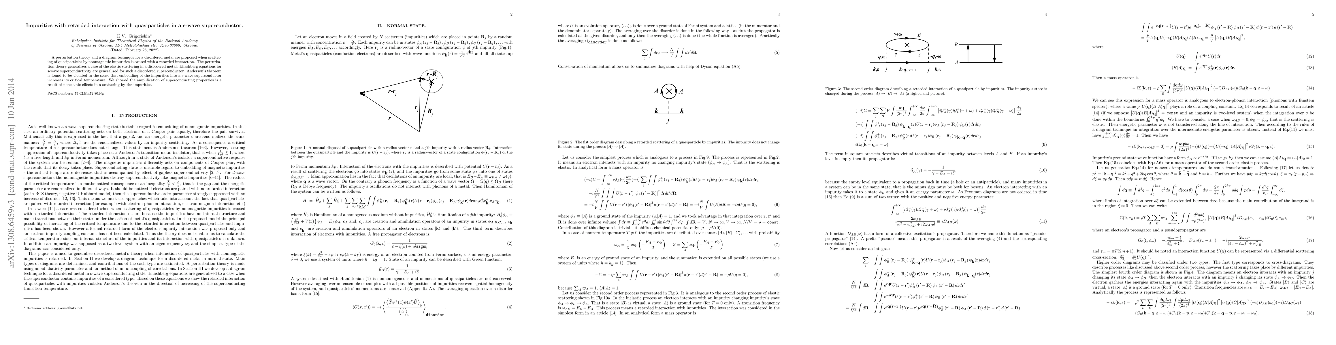 This paper proposes a new perturbation theory and diagram technique for analyzing disordered metals where quasiparticles scatter via retarded interactions with nonmagnetic impurities. It generalizes the Eliashberg equations for s-wave superconductors, revealing that impurity embedding can increase the critical temperature, contradicting Anderson's theorem and attributing this effect to nonelastic scattering processes.
