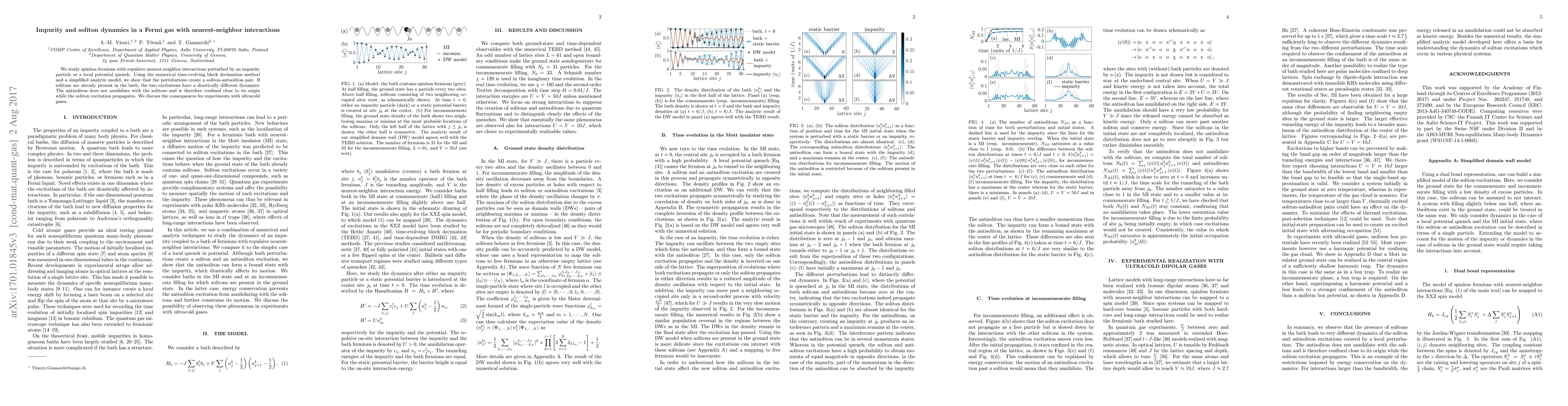 We study spinless fermions with repulsive nearest-neighbor interactions perturbed by an impurity particle or a local potential quench. Using the numerical time-evolving block decimation method and a simplified analytic model, we show that the pertubations create a soliton-antisoliton pair. If solitons are already present in the bath, the two excitations have a drastically different dynamics: The antisoliton does not annihilate with the solitons and is therefore confined close to its origin while the soliton excitation propagates. We discuss the consequences for experiments with ultracold gases.