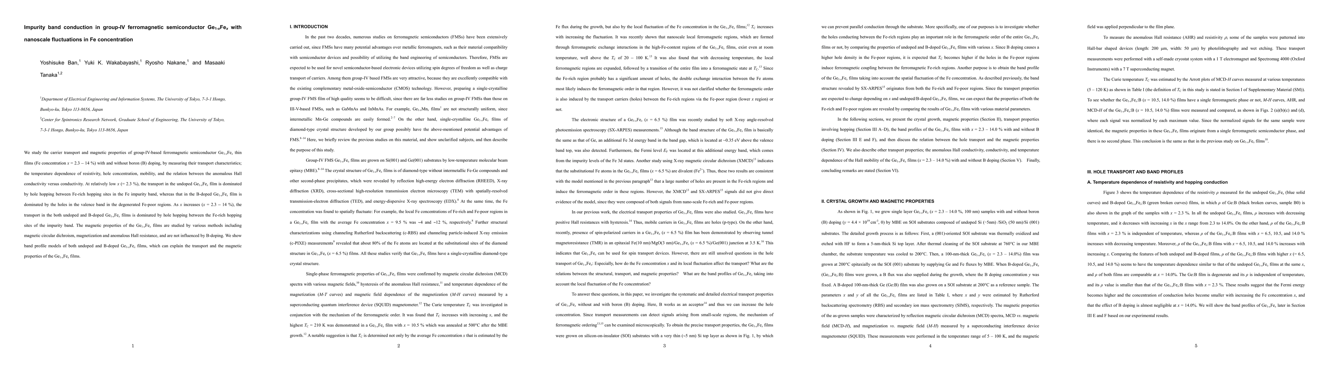 This paper investigates the carrier transport and magnetic properties of Ge1-xFex thin films with varying Fe concentration, showing that at low Fe content, undoped films transport via hole hopping in an Fe impurity band, while B-doped films transport through valence band holes in Fe-poor regions. As Fe concentration increases, both types of films exhibit impurity band conduction. Magnetic properties remain unaffected by B-doping.