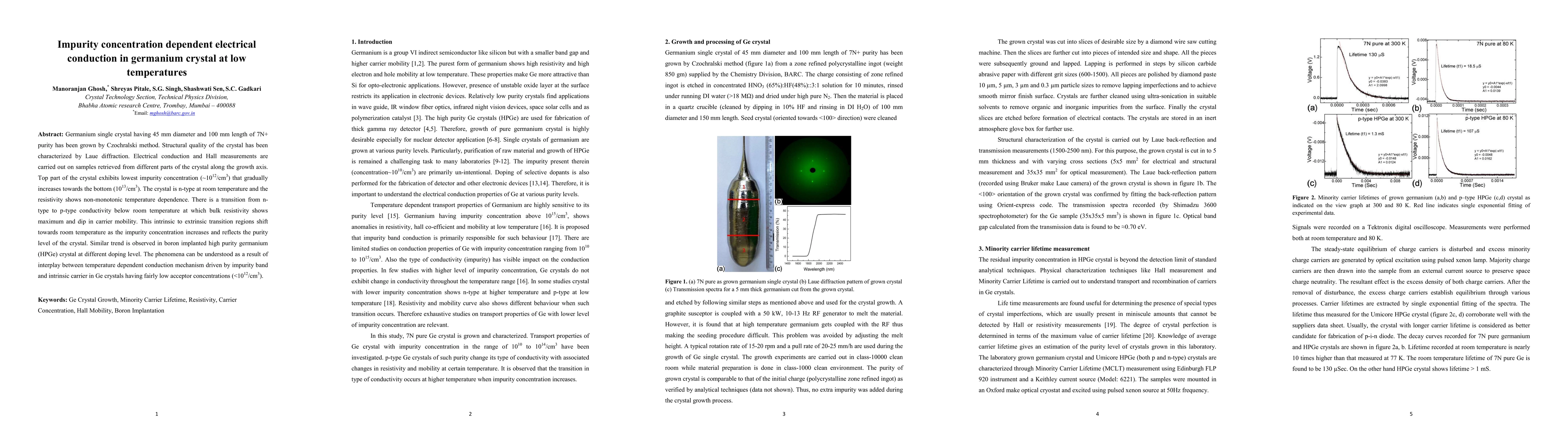 Germanium single crystal having 45 mm diameter and 100 mm length of 7N+ purity has been grown by Czochralski method. Structural quality of the crystal has been characterized by Laue diffraction. Electrical conduction and Hall measurements are carried out on samples retrieved from different parts of the crystal along the growth axis. Top part of the crystal exhibits lowest impurity concentration (~10^12/cm3) that gradually increases towards the bottom (10^13/cm3). The crystal is n-type at room temperature and the resistivity shows non-monotonic temperature dependence. There is a transition from n-type to p-type conductivity below room temperature at which bulk resistivity shows maximum and dip in carrier mobility. This intrinsic to extrinsic transition regions shift towards room temperature as the impurity concentration increases and reflects the purity level of the crystal. Similar trend is observed in boron implanted high purity germanium (HPGe) crystal at different doping level. The phenomena can be understood as a result of interplay between temperature dependent conduction mechanism driven by impurity band and intrinsic carrier in Ge crystals having fairly low acceptor concentrations (<10^12/cm3).
