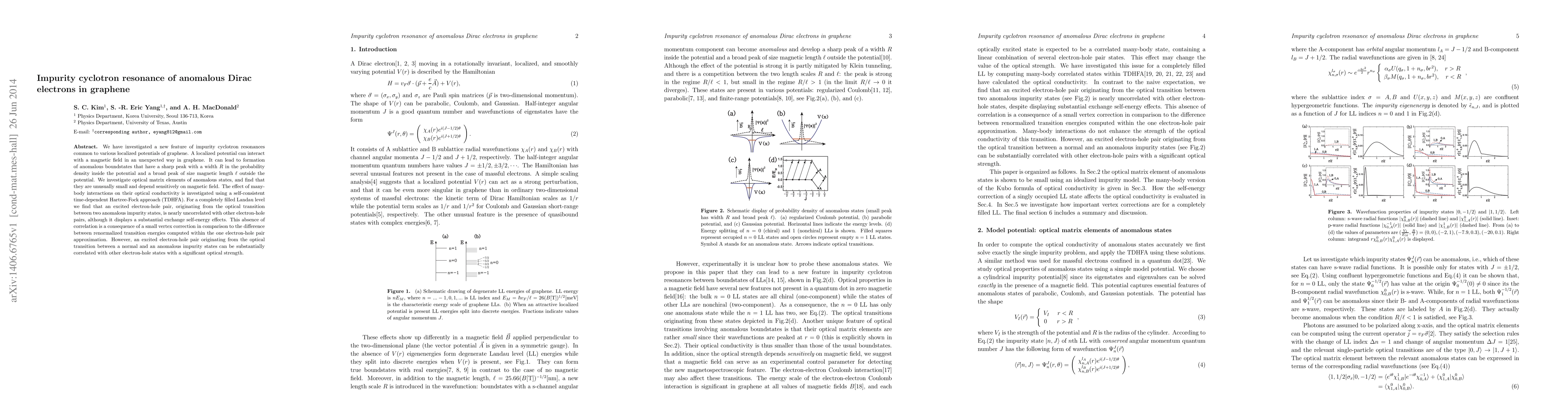 This paper investigates impurity cyclotron resonances in graphene, revealing the formation of anomalous boundstates due to localized potentials interacting with magnetic fields. The study finds that optical matrix elements of these states are small and sensitive to magnetic fields, and many-body interactions show that electron-hole pairs from optical transitions between anomalous and normal states exhibit varying degrees of correlation.