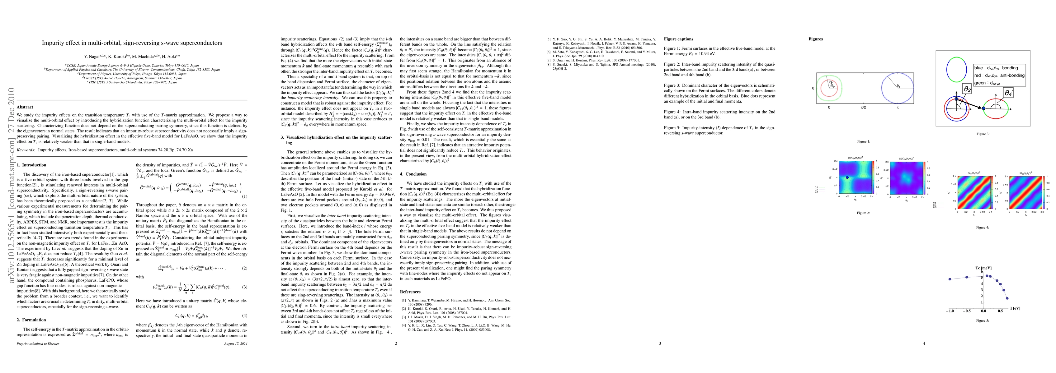 The research explores impurity effects on transition temperature Tc in multi-orbital, sign-reversing s-wave superconductors using T-matrix approximation. It introduces a hybridization function to visualize multi-orbital effects, independent of pairing symmetry. This function, based on normal state eigenvectors, reveals that impurity-robust superconductivity doesn't guarantee sign-preserving pairing. Applying this to a five-band model of LaFeAsO, the study shows that impurity impact on Tc is less severe compared to single-band models.