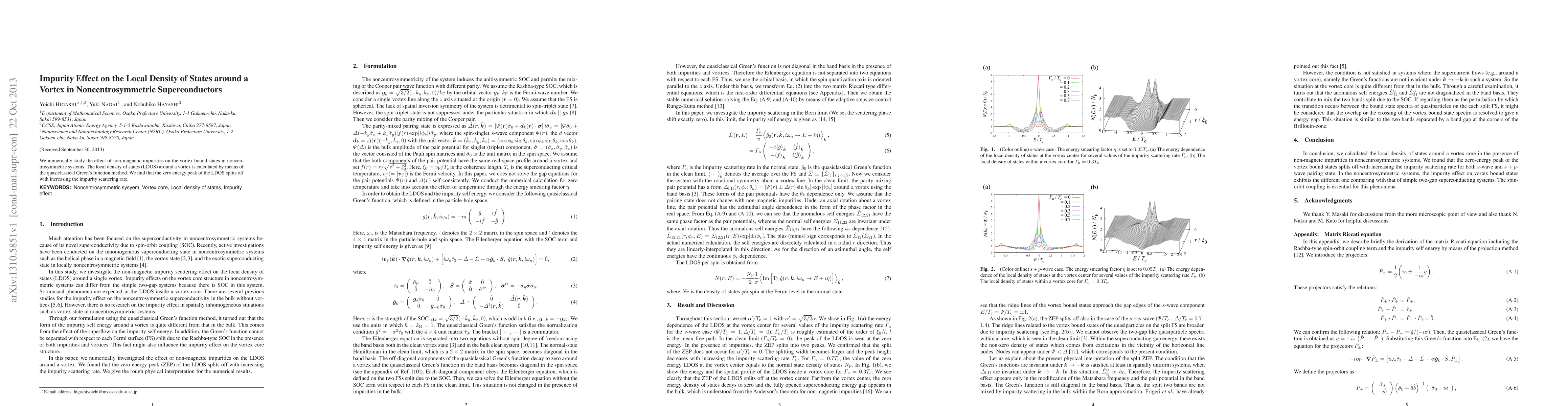 Summary: This study numerically investigates the impact of non-magnetic impurities on vortex bound states in noncentrosymmetric superconductors, revealing that the zero energy peak in the local density of states splits as impurity scattering increases.