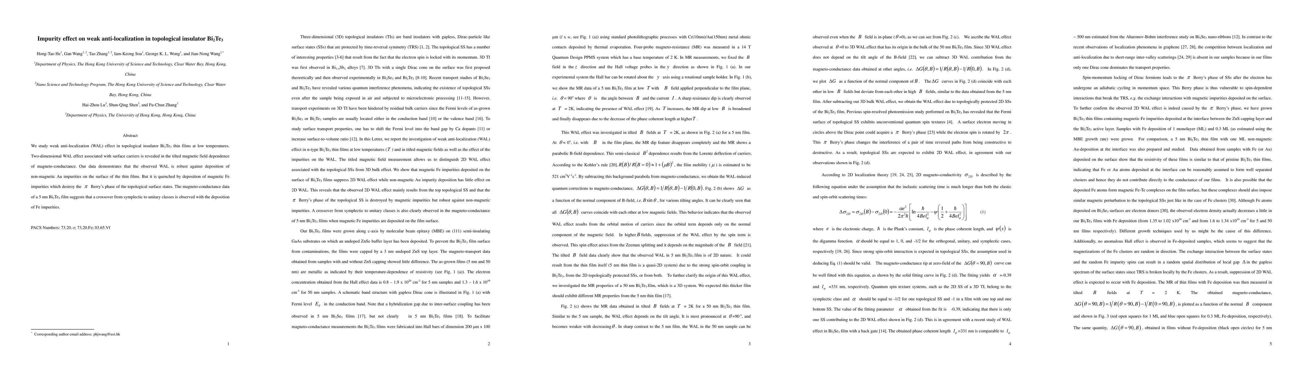 This study investigates the weak anti-localization effect in Bi2Te3 topological insulator thin films, revealing that while non-magnetic Au impurities do not affect it, magnetic Fe impurities quench the effect by disrupting the pi Berry's phase of the topological surface states, indicating a crossover from symplectic to unitary classes.